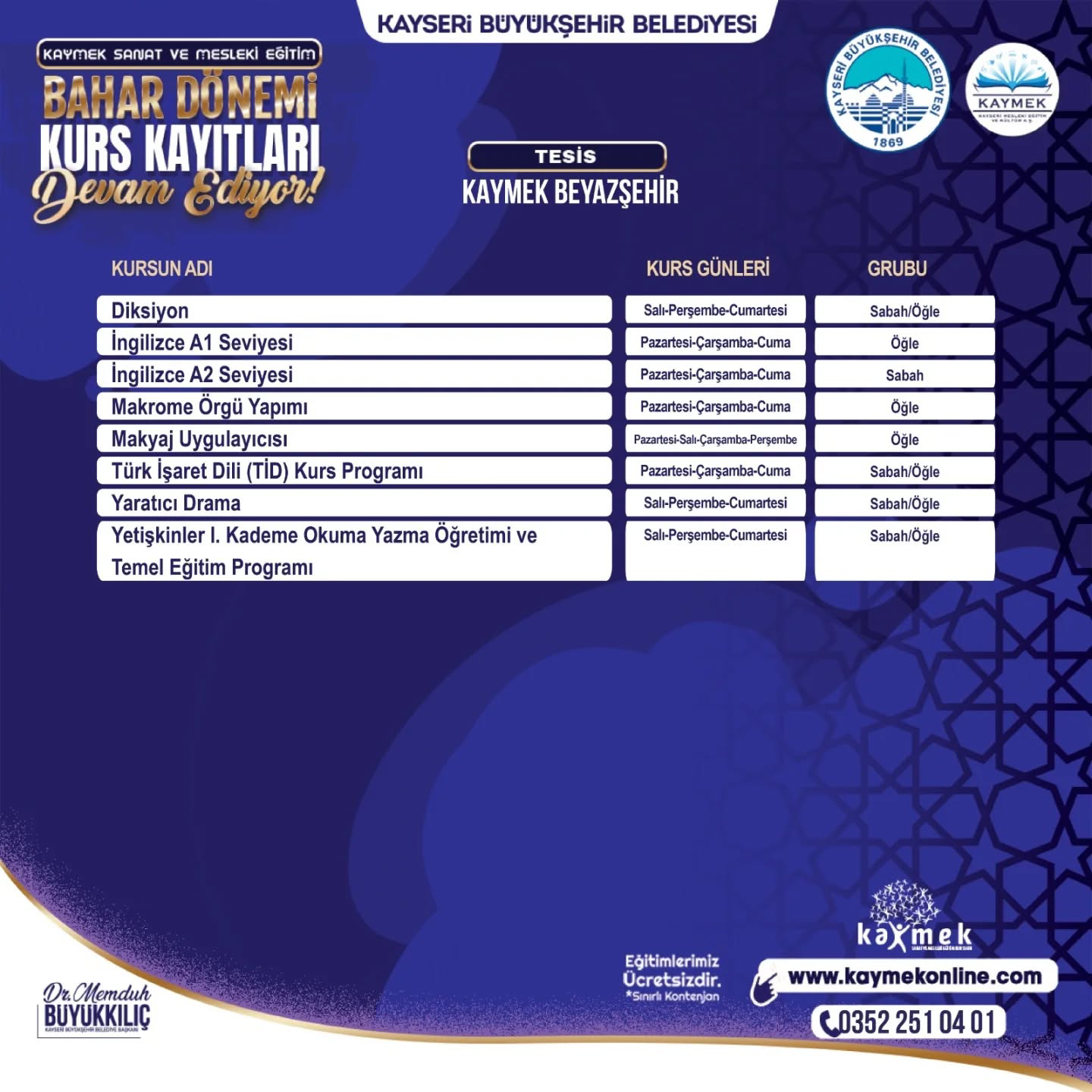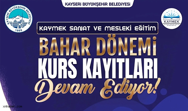 Kayseri’de çocuklar ve gençler ile her yaş grubundan vatandaşlara yönelik Sanat ve Mesleki Eğitim Bahar Dönemi kurs kayıtları devam ediyor. Kayseri Mesleki Eğitim ve Kültür A.Ş. (KAYMEK) tarafından verilen kurslar, 12 Ocak 2026’da başladı ve 1 Şubat 2026’ya kadar başvurular alınacak.