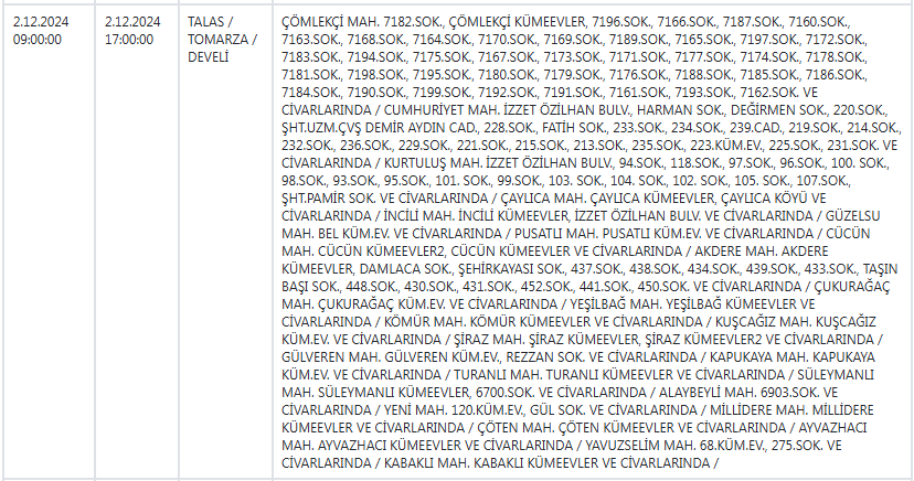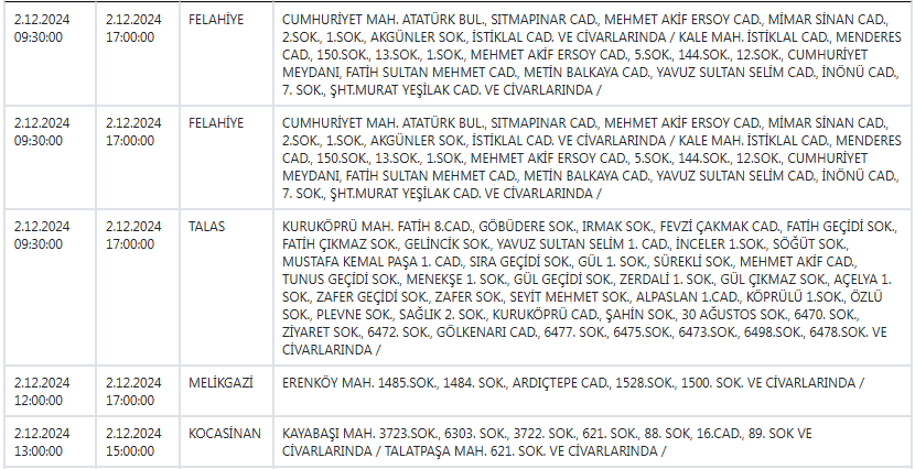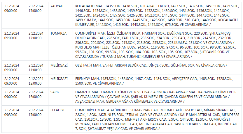 Kayseri’de Elektrik Kesintisi Yaşanacak: KCETAŞ’tan Önemli DuyuruKayseri’de 2 Aralık 2024 Pazartesi günü bazı mahallelerde elektrik kesintisi yaşanacak. Kayseri ve Civarı Elektrik Türk A.Ş. (KCETAŞ) tarafından yapılan açıklamaya göre, kesintinin sebebi trafo bakım ve onarım çalışmaları olarak açıklandı. Çalışmaların enerji hatlarının daha verimli ve güvenli bir şekilde hizmet verebilmesi için düzenli aralıklarla yapıldığı belirtildi.Vatandaşlara Uyarı