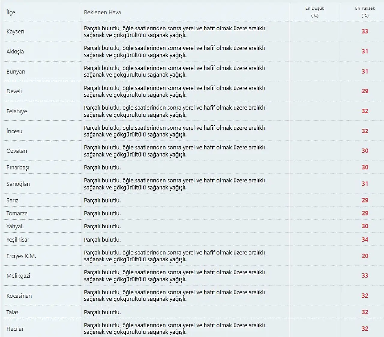 Bugün (6 Eylül) Kayseri’de hava parçalı bulutlu olacak. Öğle saatlerinden sonra ise yerel ve hafif şekilde aralıklı sağanak ve gök gürültülü sağanak yağışlar bekleniyor. Kentte günün en yüksek sıcaklığı 32, en düşük sıcaklığı ise 14 derece olacak. İlçeler arasında en yüksek sıcaklığın ise Yeşilhisar’da 34 dereceye ulaşması öngörülüyor.