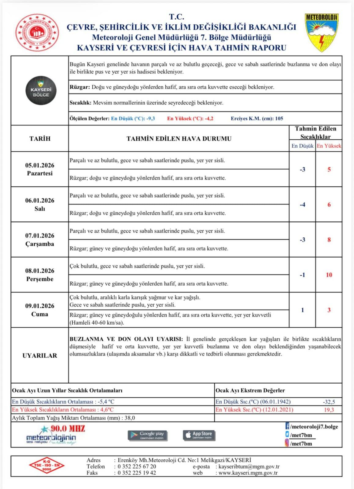 Meteoroloji verilerine göre 5 Ocak Pazartesi günü Kayseri’de en düşük sıcaklık eksi 3, en yüksek sıcaklık 5 derece olacak.