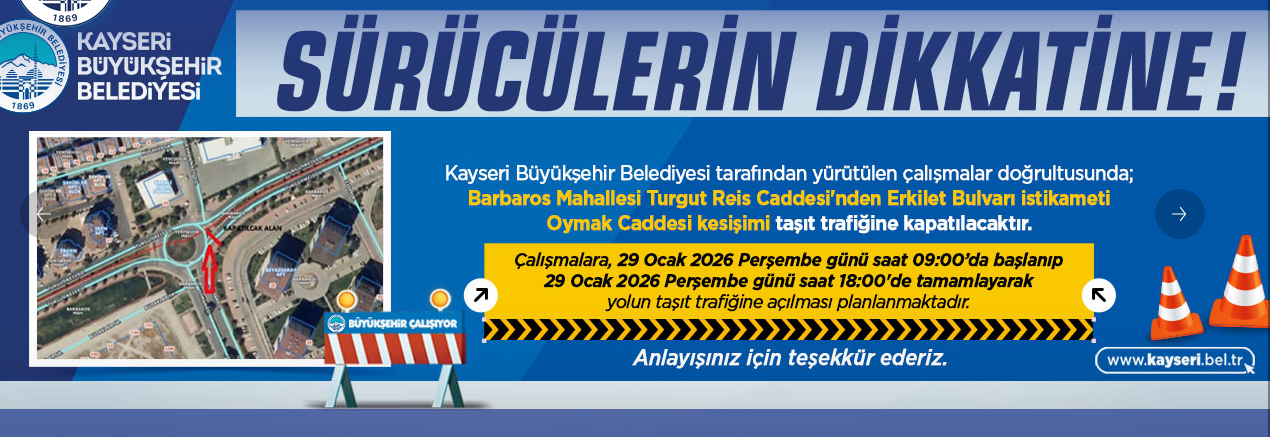 Kayseri’de ulaşım ve altyapı çalışmaları kapsamında Barbaros ve Buğdaylı Mahallesi’nde önemli trafik düzenlemeleri uygulanacak. Kayseri Büyükşehir Belediyesi’nin açıklamasına göre, 29 Ocak 2026 Perşembe günü sabah 09.00’da başlayacak çalışmalar aynı gün saat 18.00’de tamamlanarak yollar yeniden araç trafiğine açılacak.