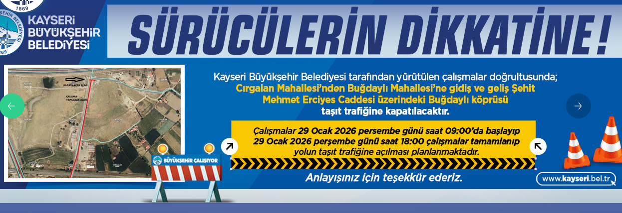 Buğdaylı Mahallesi’nde ise Cırgalan Mahallesi yönünden gidiş-geliş, Şehit Mehmet Erciyes Caddesi üzerindeki Buğdaylı köprüsü ile sınırlı olacak şekilde geçici olarak kapatılacak. Belediye, sürücülerden belirtilen saatlerde alternatif güzergahları kullanmalarını istedi.