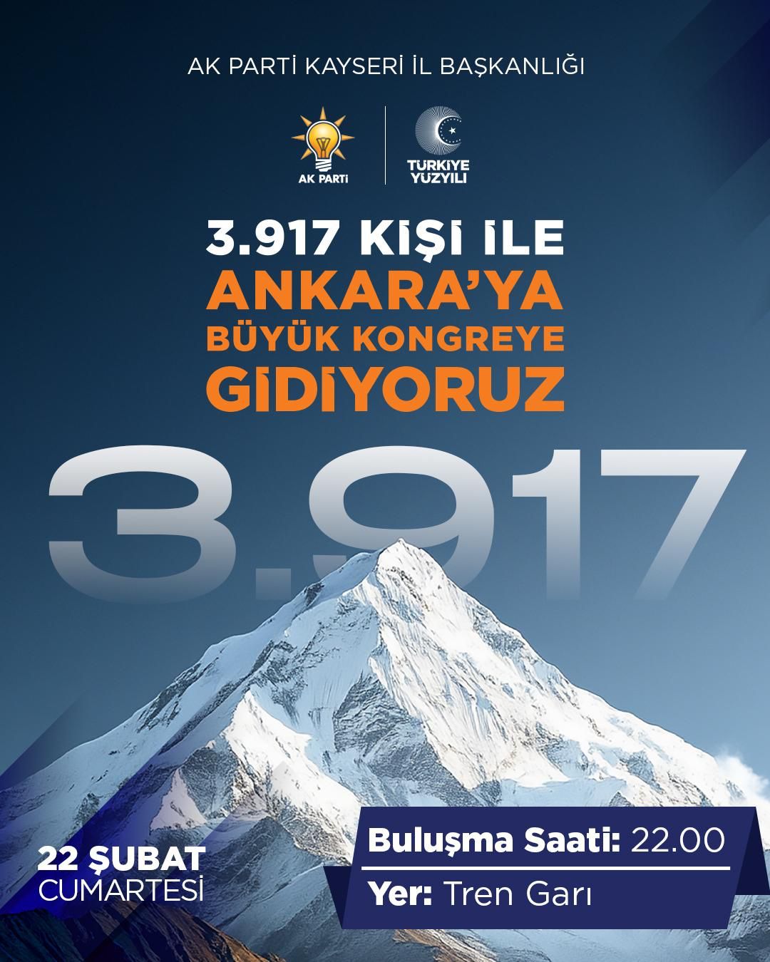 AK Parti Kayseri teşkilatı, 8. Olağan Büyük Kongresi’ne güçlü bir katılım sağlamak için hazırlıklarını tamamladı. Kayseri’den 3.917 partili, büyük kongreye katılmak üzere 22 Şubat Cumartesi günü saat 22:00’de Kayseri Tren Garı’ndan yola çıkacak.