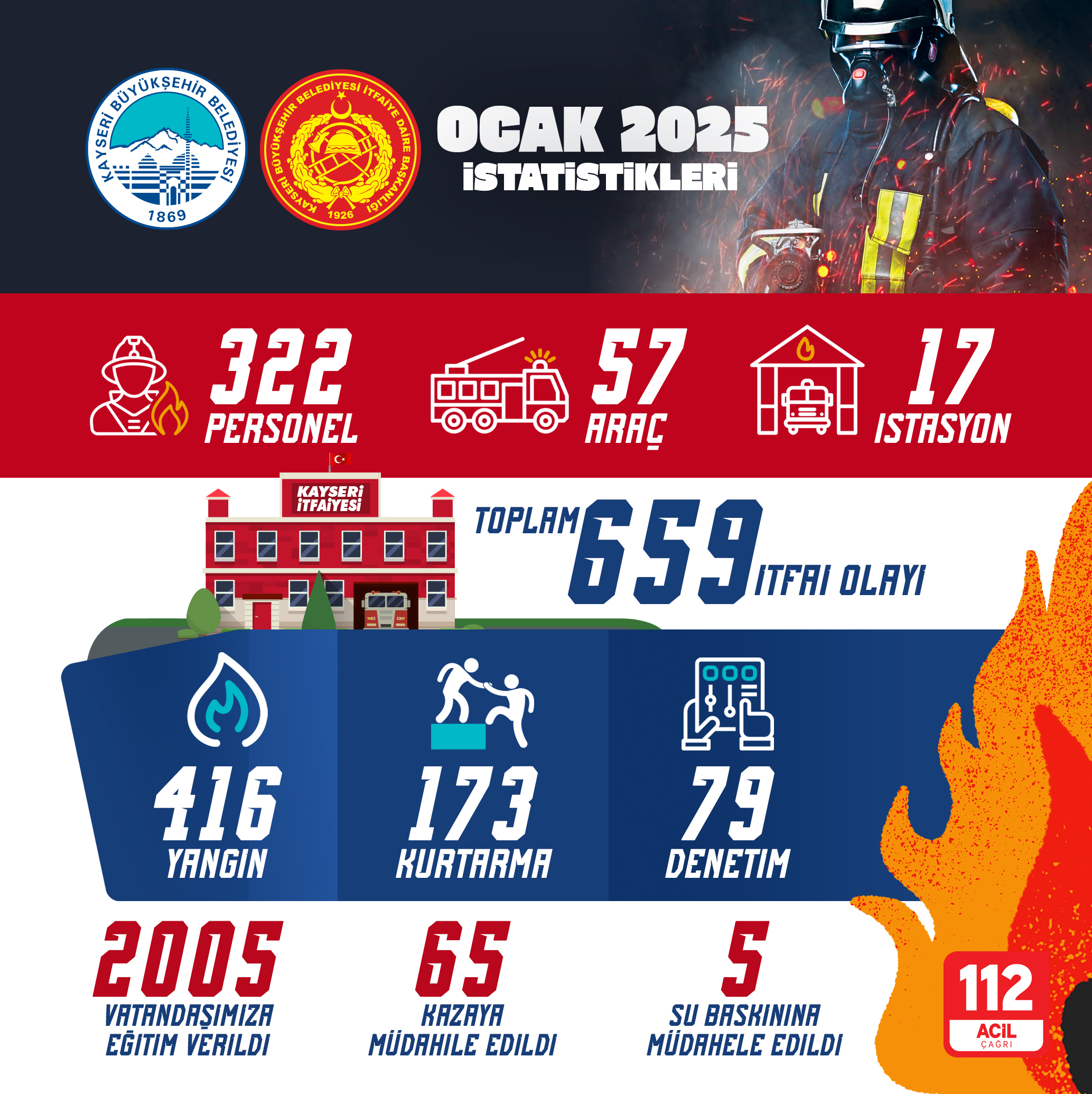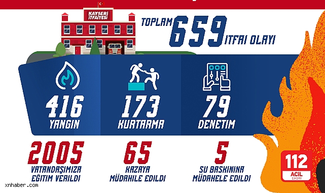 Kayseri Büyükşehir Belediyesi İtfaiye Daire Başkanlığı, Ocak ayında toplamda 659 olaya müdahale ederek, vatandaşların güvenliği için büyük bir özveriyle görev yaptı. İtfaiye teşkilatı, 17 istasyon, 57 araç ve 322 personelle her türlü acil durumda müdahaleye hazır bir şekilde çalışmalarını sürdürüyor. Bu kapsamda, 416 yangına, 65 trafik kazasına, 5 su baskınına ve 173 kurtarma olayına müdahale edilerek başarılı sonuçlar elde edildi.