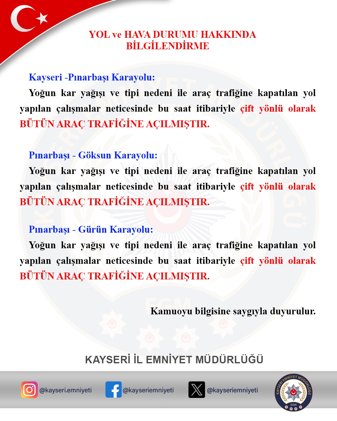 Kayseri-Pınarbaşı karayolu, Pınarbaşı-Göksun karayolu ve Pınarbaşı-Gürün karayolu, bölgede etkili olan yoğun kar ve tipi nedeniyle geçici süreyle kapatılmıştı. Karayolları ekiplerinin yürüttüğü yoğun temizlik ve tuzlama çalışmaları sonrası yollar, sürücüler için güvenli şekilde kullanıma açıldı.