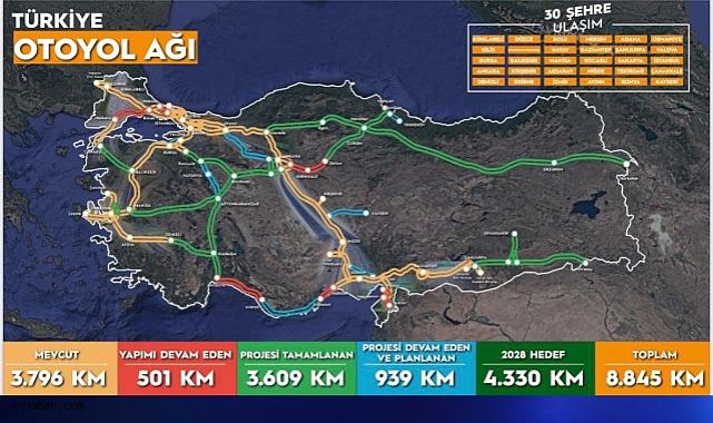 Kayseri, ulaşım altyapısında önemli bir dönemece hazırlanıyor. Ulaştırma ve Altyapı Bakanlığı tarafından açıklanan güncel Türkiye Otoyol Ağı haritası, şehrimizin devam eden otoyol projeleriyle birlikte geleceğe güçlü bir adım attığını gösteriyor.AK Parti Kayseri İl Başkanı Hüseyin Okandan, konuyla ilgili olarak yaptığı açıklamada, “Şehrimize değer katacak her hamlenin yakından takipçisiyiz. Yakında Kayseri’den doğrudan otoyola bağlanmak mümkün olacak. Bu yeni güzergâh, sadece ulaşımı hızlandırmakla kalmayacak; şehirler arası mesafeleri kısaltacak, ticaretten turizme kadar her alanda Kayseri’ye yeni bir canlılık kazandıracak,” ifadelerini kullandı.Türkiye genelinde otoyol altyapısı hızla gelişiyor:Mevcut otoyol: 3.796 kmYapımı devam eden: 501 kmTamamlanan projeler: 3.609 kmDevam eden ve planlanan projeler: 939 km2028 hedefi: 4.330 kmToplam otoyol ağı: 8.845 kmKayseri’nin bu yeni bağlantılarla hem ekonomik hem de turistik olarak büyük avantajlar elde etmesi bekleniyor. Şehir, Türkiye’nin otoyol ağındaki konumunu güçlendirirken, yatırım ve ulaşımda yeni fırsatlara kapı aralayacak.