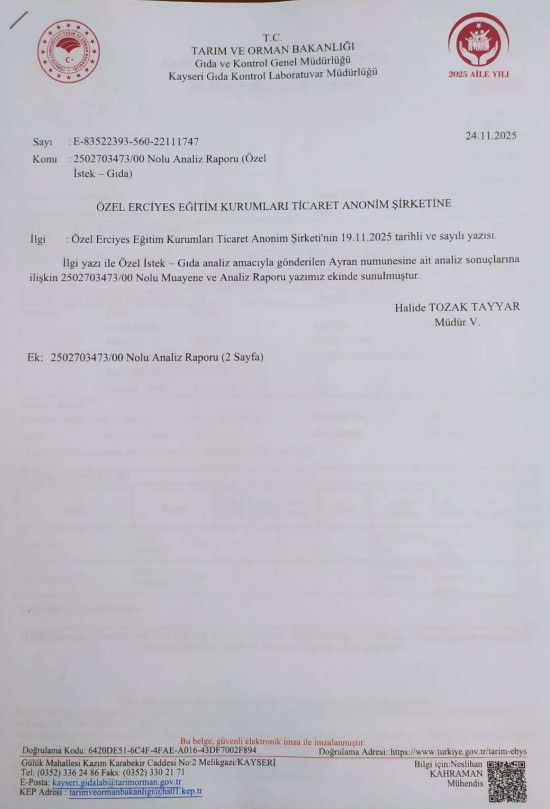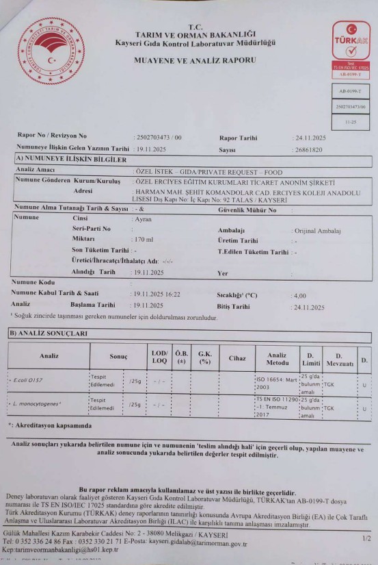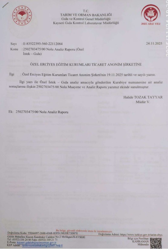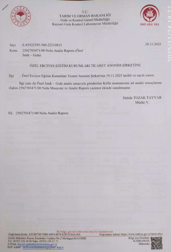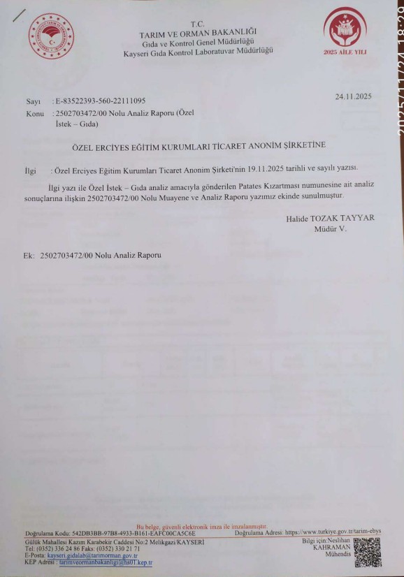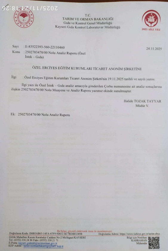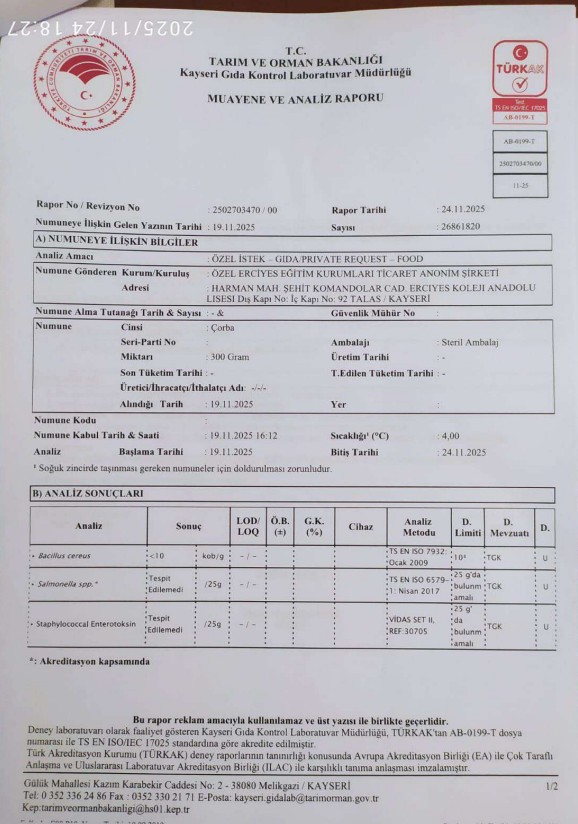 Haberinizle ilgili olarak süreç hakkında doğru bilgilendirme yapmak amacıyla bu resmî açıklamanın yapılması gerekli görülmüştür.18 Kasım 2025 tarihinde, ilkokul 2. sınıf şubelerimizden birinde öğrenim gören 6 öğrencimizin benzer şikâyetlerle acil tıbbi hizmet almak üzere başvurdukları sağlık kuruluşlarında, yaşanan durumun tüketilen gıdalardan kaynaklanıp kaynaklanmadığı netleşmeyince konu okul yönetimine iletilmiştir. Okul yönetimi, kampüsümüzdeki gıda üretim süreçlerine duyduğumuz güvenle birlikte öğrencilerimizin sağlığını her şeyin üzerinde tutarak velilerimizi bilgilendirmek amacıyla, 18 Kasım 2025 tarihine ait tüm öğünlerin şahit numunelerini Kayseri Gıda Kontrol Laboratuvarına göndermiştir.24 Kasım 2025 tarihi itibarıyla tarafımıza ulaşan resmî analiz sonucuna göre:O güne ait tüm ürünler mikrobiyolojik açıdan tamamen temiz çıkmıştır.Servis edilen hiçbir gıdada sağlık riski, mikrobiyolojik bulaş veya uygunsuzluk tespit edilmemiştir.Yemekhane süreçlerimiz, üretimden sunuma kadar tüm aşamalarda hem kurum içi denetim mekanizmalarımız hem de bağımsız laboratuvarlar tarafından düzenli olarak kontrol edilmektedir.Erciyes Koleji, her zaman olduğu gibi tüm süreçlerini şeffaflıkla yürütmeye, öğrencilerimizin sağlığına ilişkin her durumu titizlikle takip etmeye devam edecektir.