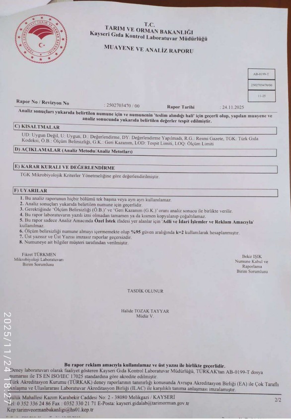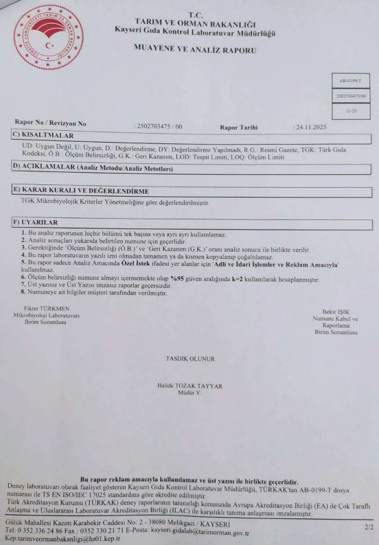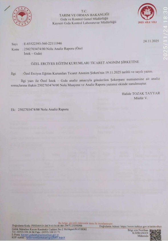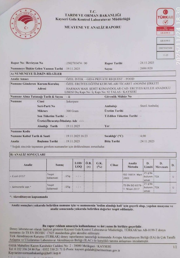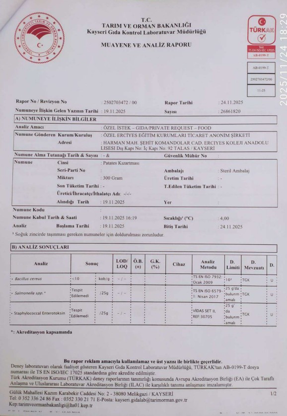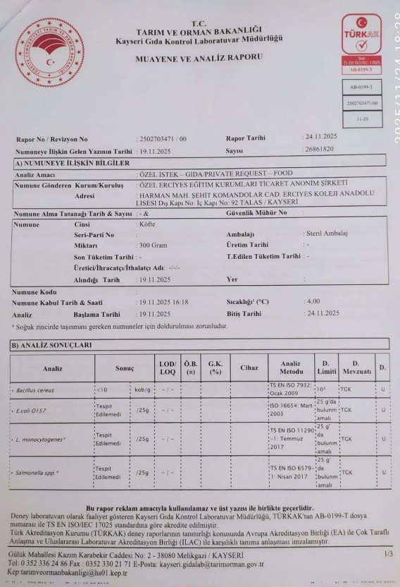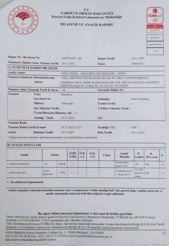 Haberinizle ilgili olarak süreç hakkında doğru bilgilendirme yapmak amacıyla bu resmî açıklamanın yapılması gerekli görülmüştür.18 Kasım 2025 tarihinde, ilkokul 2. sınıf şubelerimizden birinde öğrenim gören 6 öğrencimizin benzer şikâyetlerle acil tıbbi hizmet almak üzere başvurdukları sağlık kuruluşlarında, yaşanan durumun tüketilen gıdalardan kaynaklanıp kaynaklanmadığı netleşmeyince konu okul yönetimine iletilmiştir. Okul yönetimi, kampüsümüzdeki gıda üretim süreçlerine duyduğumuz güvenle birlikte öğrencilerimizin sağlığını her şeyin üzerinde tutarak velilerimizi bilgilendirmek amacıyla, 18 Kasım 2025 tarihine ait tüm öğünlerin şahit numunelerini Kayseri Gıda Kontrol Laboratuvarına göndermiştir.24 Kasım 2025 tarihi itibarıyla tarafımıza ulaşan resmî analiz sonucuna göre:O güne ait tüm ürünler mikrobiyolojik açıdan tamamen temiz çıkmıştır.Servis edilen hiçbir gıdada sağlık riski, mikrobiyolojik bulaş veya uygunsuzluk tespit edilmemiştir.Yemekhane süreçlerimiz, üretimden sunuma kadar tüm aşamalarda hem kurum içi denetim mekanizmalarımız hem de bağımsız laboratuvarlar tarafından düzenli olarak kontrol edilmektedir.Erciyes Koleji, her zaman olduğu gibi tüm süreçlerini şeffaflıkla yürütmeye, öğrencilerimizin sağlığına ilişkin her durumu titizlikle takip etmeye devam edecektir.
