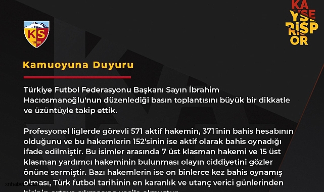Kayserispor Kulübü, futbolda adaletin birinci unsur olduğunu vurgulayarak, TFF’nin bu çalışmalarını derinleştirmesi ve bahis oynayan hakemlerin isimlerini, hangi maçlarda bahis oynadıklarını şeffaf bir şekilde açıklamasını talep etti. Kulüp, Türk futbolunun artık karanlık skandallarla değil; adaletli, şeffaf ve mücadeleci bir kimlikle anılması gerektiğini belirtti.