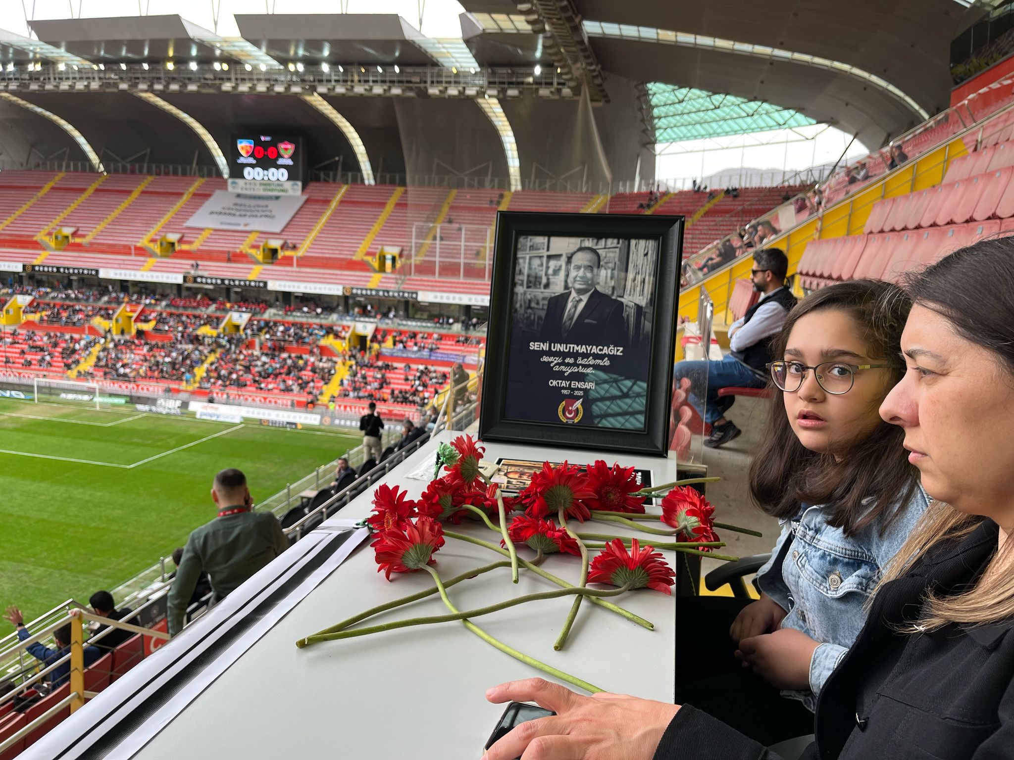 Ensari’nin basın tribününde oturduğu koltuğa karanfiller bırakan meslektaşları, basın tribünün ön yüzüne de Oktay Ensari’nin fotoğrafının bulunduğu ‘seni unutmayacağız’ yazılı pankart astı. Diğer yandan Oktay Ensari’nin eşi ve çocukları da basın tribününde Oktay Ensari’nin her zaman Kayserispor maçlarını takip ettiği bölümden karşılaşmayı seyretti.