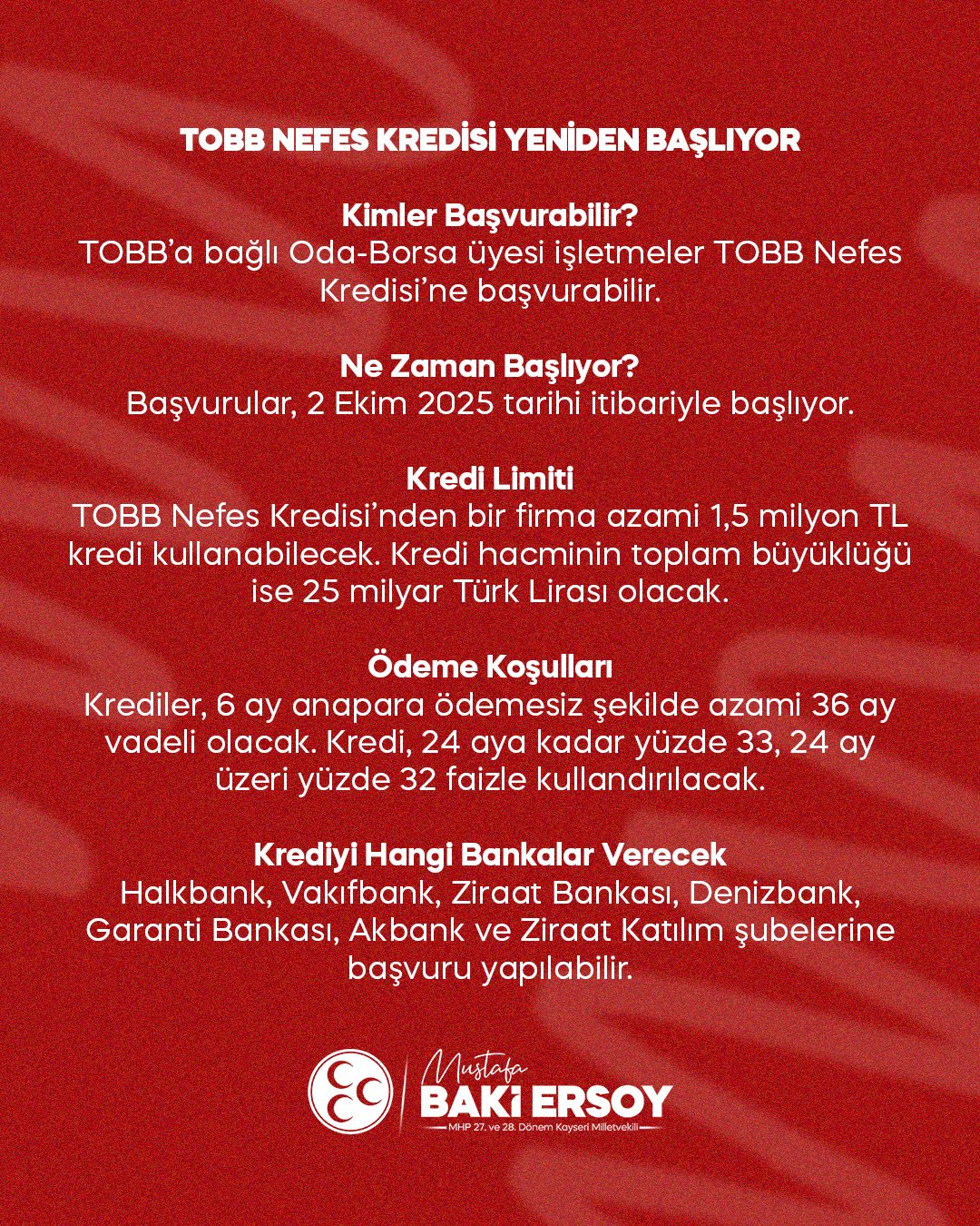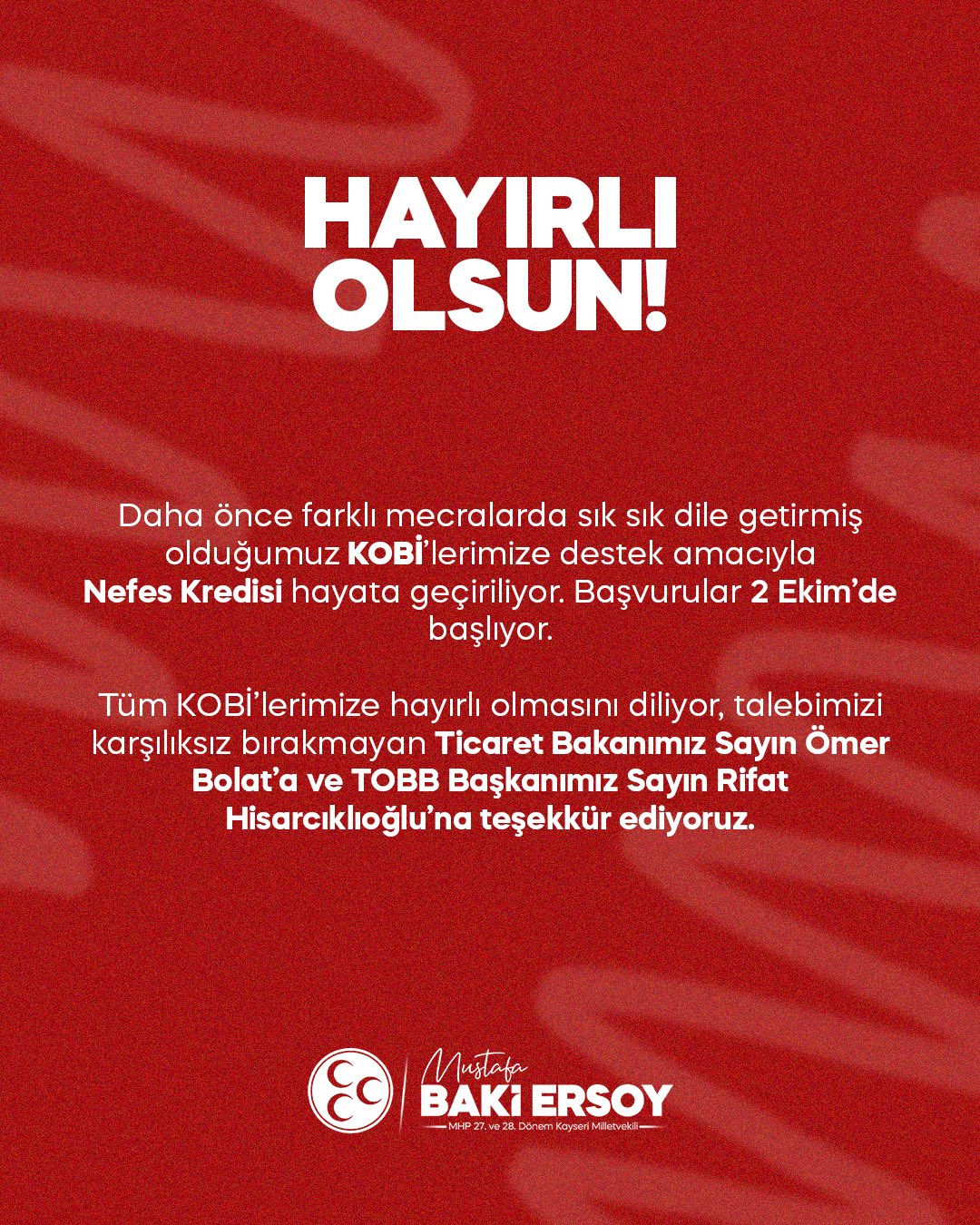 MHP Kayseri Milletvekili Baki Ersoy, sosyal medya hesabından yaptığı paylaşımda, KOBİ’ler için büyük önem taşıyan bu destek paketini duyurdu. Ersoy, kredinin hayırlı olmasını dileyerek, talebin karşılıksız bırakılmamasında emeği geçen Ticaret Bakanı Ömer Bolat ve TOBB Başkanı Rifat Hisarcıklıoğlu’na teşekkür etti.