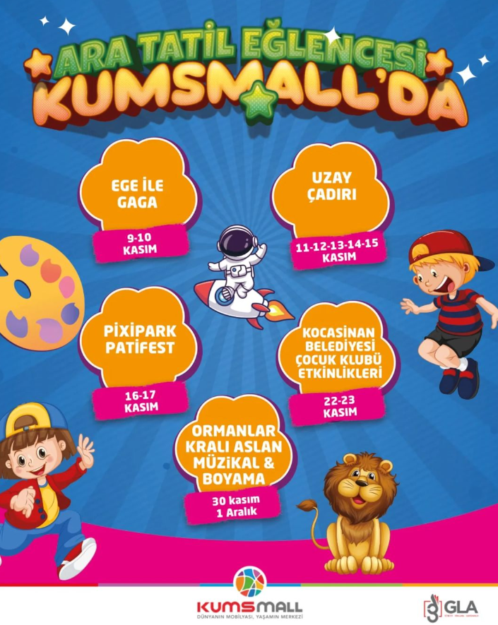 Ara tatil, Kumsmall’da minikler için unutulmaz anlara sahne olacak! Her yaştan çocuk için özel olarak hazırlanan bu etkinlikler, tatilin eğlenceli geçmesini sağlarken çocukların yaratıcılıklarını da geliştirmelerine olanak tanıyacak.Etkinlik Programı:Ege ile Gaga (9-10 Kasım)Küçükleri macera dolu bir yolculuğa çıkaracak Ege ile Gaga gösterisi, çocukları ekranların sevilen karakterleriyle buluşturuyor. İki gün boyunca sürecek olan bu gösteride çocuklar, Ege ve Gaga’nın büyülü dünyasına katılarak neşe dolu anlar yaşayacaklar.Uzay Çadırı (11-12-13-14-15 Kasım)Uzaya merak duyan çocuklar için özel olarak kurulan Uzay Çadırı, küçükleri bir astronot gibi hissettirecek. Astronot kıyafetlerini giyip uzayın derinliklerine yapacakları bu eğlenceli yolculukta çocuklar, uzay hakkında yeni bilgiler öğrenmenin tadını çıkaracaklar.Pixipark Patifest (16-17 Kasım)Hayvan dostlarıyla dolu bir hafta sonu minikleri bekliyor. Pixipark Patifest etkinliğinde çocuklar, sevimli patilerle tanışıp hayvan sevgisini pekiştirecekler. Bu festivalde hayvanlarla etkileşim kurarak onlara nasıl saygı duyulması gerektiğini öğrenecekler.Kocasinan Belediyesi Çocuk Kulübü Etkinlikleri (22-23 Kasım)Kocasinan Belediyesi iş birliğiyle düzenlenen bu atölyelerde çocuklar, sanatsal yönlerini keşfedecekler. Birbirinden farklı yaratıcı etkinliklerle dolu bu günlerde, minikler hayal dünyalarını renklendirecekler.Ormanlar Kralı Aslan Müzikal & Boyama (30 Kasım - 1 Aralık)Ayın son etkinliği olan Ormanlar Kralı Aslan, çocukları müzikal bir gösteriye davet ediyor. Aslan temalı boyama aktiviteleriyle birlikte sunulacak olan bu etkinlik, çocuklara hem eğlenceli hem de yaratıcı bir deneyim sunacak.Tüm bu etkinlikler boyunca çocuklar, hem eğlenecek hem de tatillerini dolu dolu geçirme şansı yakalayacaklar. Kumsmall’da ücretsiz olarak sunulan bu aktivitelerle çocuklarınız için keyifli ve unutulmaz bir tatil deneyimi sağlamak mümkün!