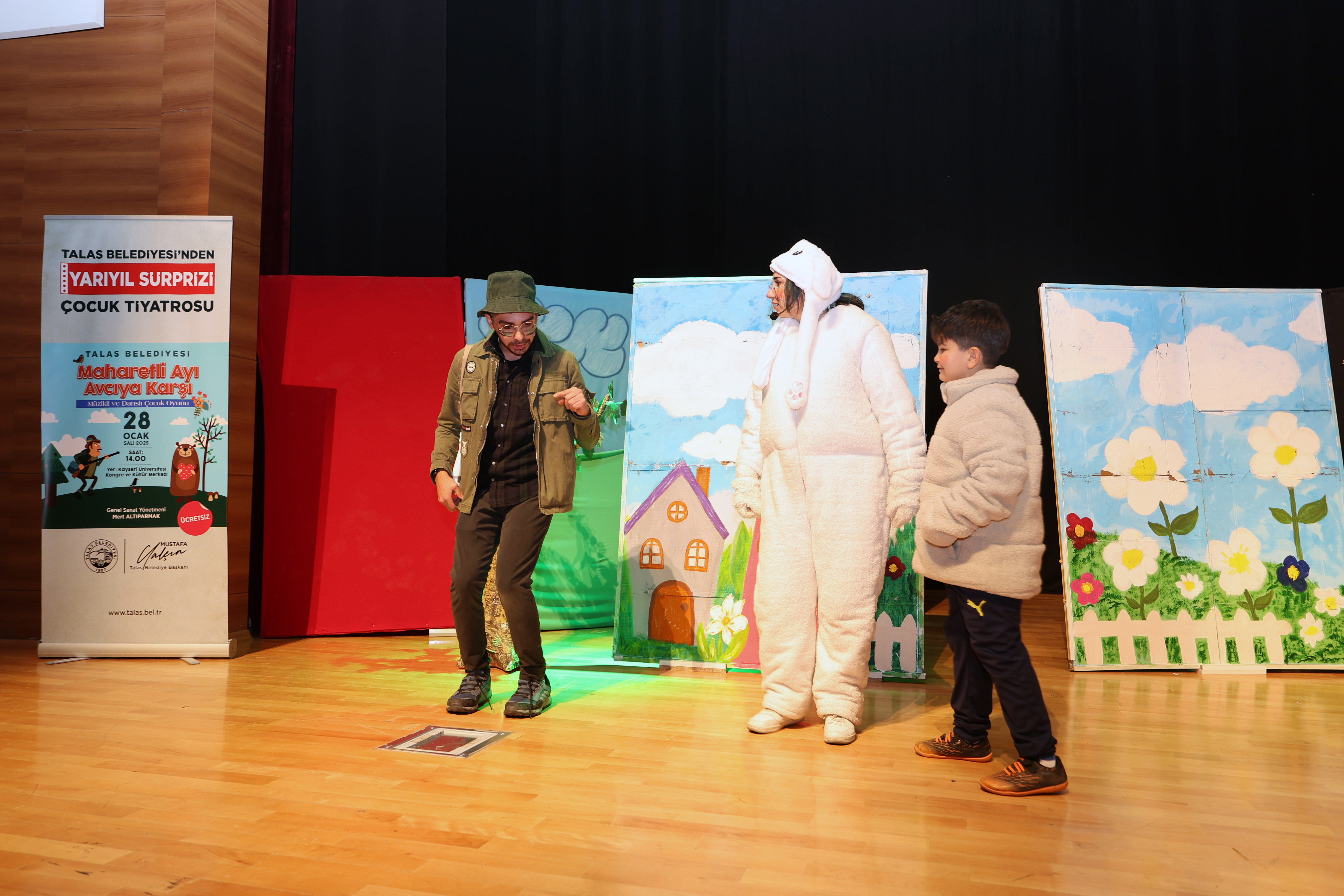 Talas Belediyesi, yarıyıl tatiline giren çocukların keyifli vakit geçirmesi için düzenlediği etkinlikler kapsamında “Maharetli Ayı Avcıya Karşı” adlı tiyatro oyununu minik izleyicilerle buluşturdu. Geçtiğimiz hafta sahnelenen “Küçük Prens” tiyatro oyununun ardından, sömestir hediyesi kapsamında sahne alan ikinci oyun da yoğun ilgi gördü.