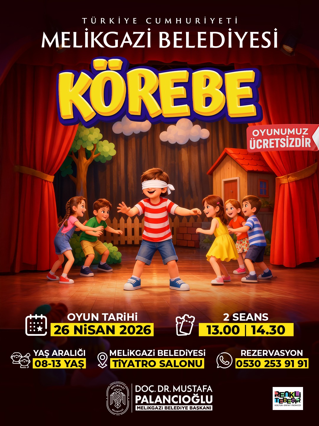 Kayseri’nin Melikgazi ilçesinde, Melikgazi Belediyesi tarafından düzenlenen kültürel etkinlikler kapsamında “Körebe” adlı müzikli tiyatro oyunu 26 Nisan’da sahnelenecek. Melikgazi Belediyesi Tiyatro Salonu’nda gerçekleştirilecek oyun, 8-13 yaş arası çocuklara yönelik olarak iki seans halinde izleyiciyle buluşacak.