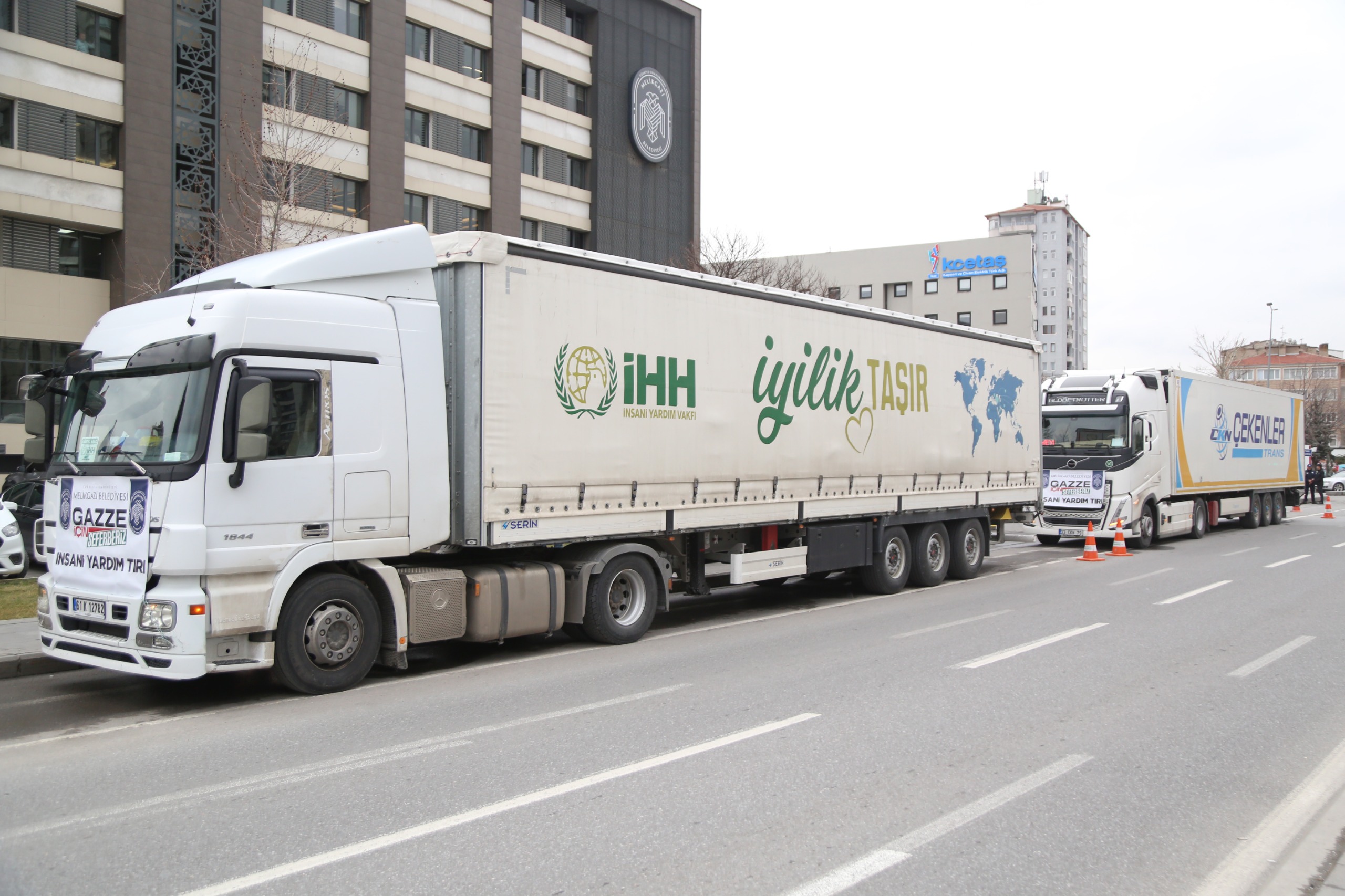 Kayseri’nin Melikgazi ilçesinde, Melikgazi Belediyesi tarafından Gazze’ye gönderilmek üzere hazırlanan yardım tırları belediye binası önünden dualarla uğurlandı. İçerisinde yatak, yorgan, yastık ve battaniyelerin bulunduğu yardım malzemeleri ihtiyaç sahiplerine ulaştırılmak üzere yola çıktı.