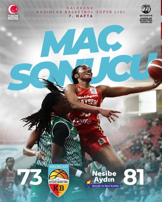 Kadınlar Basketbol Süper Ligi’nin heyecan dolu 7. haftasında Melikgazi Kayseri Basketbol, Kadir Has Spor Salonu’nda ağırladığı Nesibe Aydın’a 81-73 mağlup oldu. Maçın başından sonuna kadar büyük çekişmeye sahne olan mücadelede, konuk ekip Nesibe Aydın kritik anlarda öne geçmeyi başardı.Maçın ilk periyodunu 21-18 önde kapatan Nesibe Aydın, ikinci periyotta Melikgazi Kayseri’nin etkili oyunu karşısında 42-40 geriye düştü. Ancak üçüncü periyotta kontrolü yeniden eline alan konuk takım, son çeyrekte de farkı koruyarak galibiyete uzandı.Ev sahibi takımda Kunek ve Williams 21’er sayı ile öne çıkarken, Dangerfield 14 sayı kaydetti. Merve Arı 7 sayı ile katkı sağladı. Nesibe Aydın’da ise Davis 22, Bone 16, Green 12 ve Yağmur Aysude 18 sayı ile takımını sırtlayan isimler oldu.Hakem triosu İsmail Binbir, Hasan Ok ve Rahmi Güner yönetiminde oynanan mücadelede, taraftarlar maç boyunca heyecanı son saniyeye kadar hissetti. Bu sonuçla Melikgazi Kayseri, sezonun 7. haftasında evinde beklenen çıkışı gösteremezken, Nesibe Aydın puanını 7’ye çıkardı.
