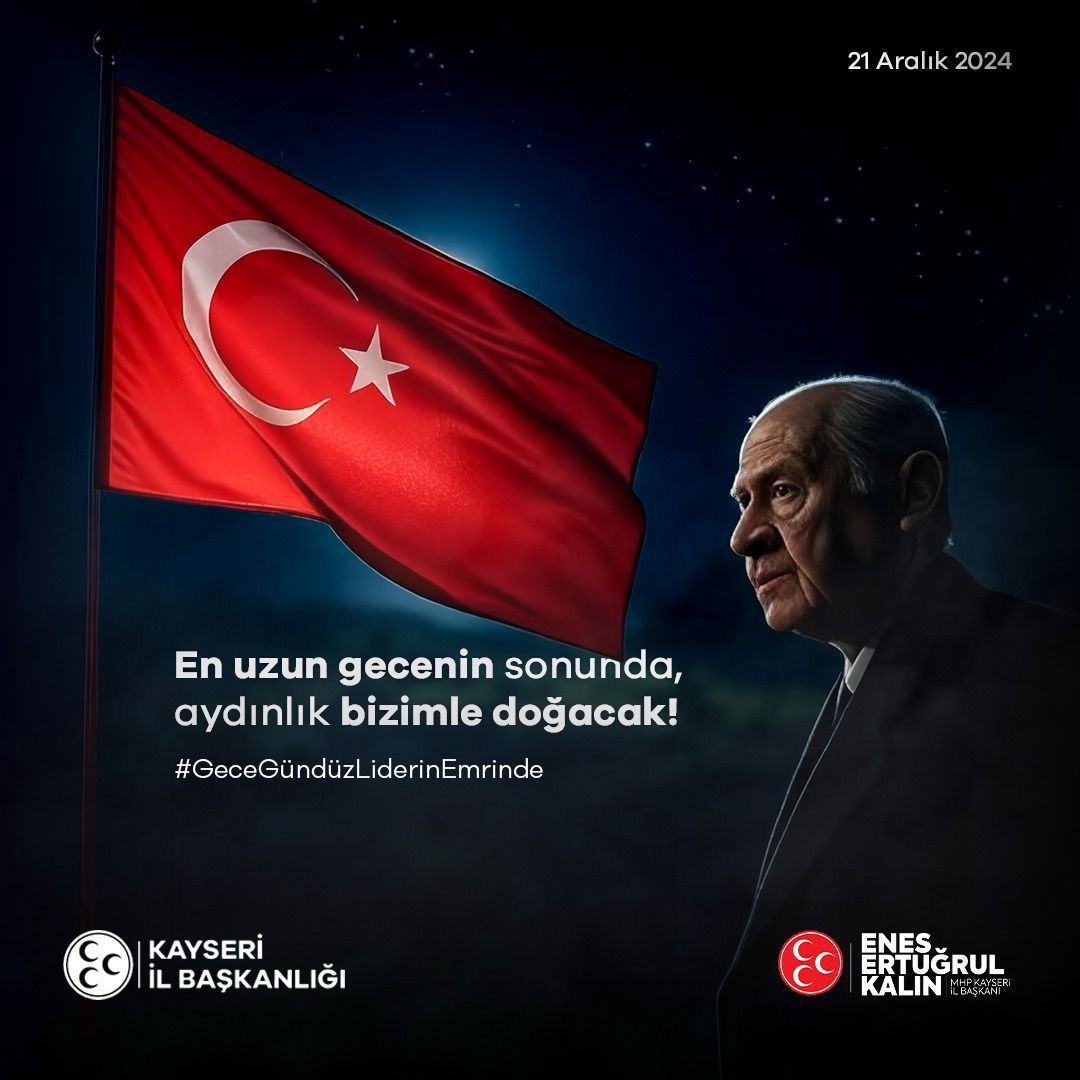 Milliyetçi Hareket Partisi (MHP) Kayseri İl Başkanlığı, 21 Aralık en uzun gecede anlamlı bir mesajla sosyal medya platformu X'te dikkat çekti. "GeceGündüzLiderinEmrinde" etiketiyle başlatılan gündem çalışması, il ve ilçe teşkilatlarının yoğun katılımıyla gerçekleştirildi.Paylaşımlarda, "En uzun gecenin sonunda, aydınlık bizimle doğacak" mesajı vurgulanırken, teşkilat mensuplarının lider Devlet Bahçeli’ye olan bağlılıkları ön plana çıkarıldı. Çalışma, kısa sürede büyük bir etkileşim alarak Türkiye gündeminde üst sıralara yükseldi.
