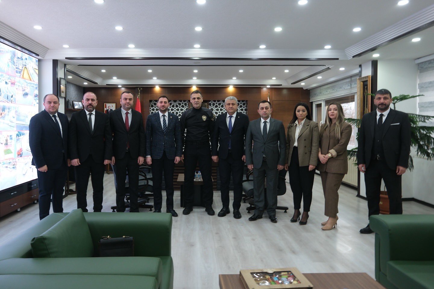 Milliyetçi Hareket Partisi (MHP) Kayseri İl Başkanı Enes Ertuğrul Kalın, beraberindeki heyetle birlikte İl Emniyet Müdürü Atanur Aydın’ı makamında ziyaret etti. Ziyarete, MHP Melikgazi İlçe Başkanı Murat Titizbaş, MHP Kocasinan İlçe Başkanı Behsat Önder, İl Başkan Yardımcıları, Kadın Aile Çocuk ve Engelli Politikaları (KAÇEP) teşkilatı ve yönetim kurulu üyeleri katıldı.Başkan Kalın, ziyarette Emniyet Müdürü Aydın’a, Kayseri’nin huzur ve güvenliği için yürüttüğü çalışmalardan dolayı teşekkürlerini ileterek, “Ülkücü Hareket olarak Emniyet Müdürlüğümüzün her zaman yanındayız ve destekçisiyiz. Nazik misafirperverlikleri için değerli müdürümüze teşekkür ediyoruz. Şehrimiz için yürüttükleri çalışmalarda başarılar diliyoruz” ifadelerini kullandı.İl Emniyet Müdürü Atanur Aydın ise Başkan Kalın ve heyetine nazik ziyaretlerinden dolayı teşekkür ederek, Kayseri’nin güvenliği için gece gündüz demeden çalıştıklarını belirtti. Aydın, şehrin huzur ve güvenliğini sağlama noktasında tüm birimlerle koordineli şekilde hareket ettiklerini vurguladı.