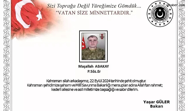 Milli Savunma Bakanlığı (MSB), 22 Eylül 2024 tarihinde Pençe-Kilit Operasyon Bölgesinde yaşanan acı bir olayı duyurdu. Terör örgütü mensuplarının yaptığı sızma girişimi sırasında, kahraman asker Piyade Sözleşmeli Er Maşallah Abakay şehit düştü. MSB’den yapılan yazılı açıklamada, “Bizleri derin bir acı ve üzüntüye boğan bu olayda hayatını kaybeden aziz şehidimize Allah'tan rahmet, kederli ailesine, Türk Silahlı Kuvvetleri ile asil milletimize başsağlığı ve sabır dileriz" ifadeleri kullanıldı.Milli Savunma Bakanı Yaşar Güler de şehit sözleşmeli er Maşallah Abakay için bir taziye mesajı yayımladı, başsağlığı dileklerinde bulundu. Pençe-Kilit Operasyonu, terör örgütüne yönelik sürdürülen kararlı mücadelenin bir parçası olarak devam ediyor.