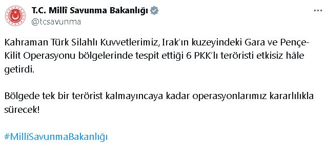 Milli Savunma Bakanlığı (MSB), Türk Silahlı Kuvvetleri'nin Irak'ın kuzeyindeki Gara ve Pençe-Kilit Operasyonu bölgelerinde başarılı bir operasyon gerçekleştirdiğini duyurdu. Bakanlığın sosyal medya hesabından yapılan açıklamaya göre, güvenlik güçleri tarafından tespit edilen 6 PKK'lı terörist etkisiz hale getirildi.Açıklamada, "Kahraman Türk Silahlı Kuvvetlerimiz, Irak'ın kuzeyindeki Gara ve Pençe-Kilit Operasyonu bölgelerinde tespit ettiği 6 PKK'lı teröristi etkisiz hale getirdi. Bölgede tek bir terörist kalmayıncaya kadar operasyonlarımız kararlılıkla sürecek" ifadesi kullanıldı.Milli Savunma Bakanlığı, Türk Silahlı Kuvvetleri'nin terörle mücadele kapsamında yurt içinde ve yurt dışında kararlı bir şekilde operasyonlarına devam edeceğini vurguladı. Bölgede güvenliği sağlamak ve teröristlerin etkisiz hale getirilmesini sağlamak amacıyla başlatılan operasyonların, bölgedeki teröristlerin tamamen temizlenene kadar süreceği belirtildi.