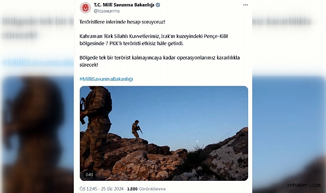 Bakanlığın sosyal medya hesabından yapılan açıklamada, "Teröristlere inlerinde hesap soruyoruz. Kahraman Türk Silahlı Kuvvetlerimiz, Irak'ın kuzeyindeki Pençe-Kilit bölgesinde 7 PKK'lı teröristi etkisiz hale getirdi. Bölgede tek bir terörist kalmayıncaya kadar operasyonlarımız kararlılıkla sürecek" denildi.