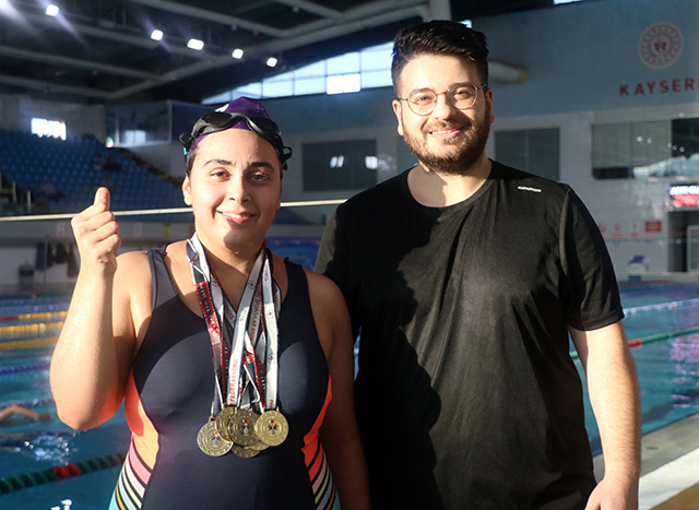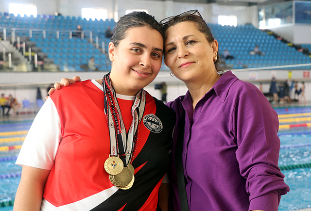 AHSEN EROL: BENİM BÜTÜN İŞİM GÜCÜM ELÇİNZorlu bir süreçten geçtiklerini aktaran anne Ahsen Erol ise, "Elçin otizmli. 1.5 yaşında hal ve harekelerindeki değişiklikleri fark ettikten sonra özel eğitime başlattık. Sıkı bir şekilde eğitim aldırdık. Kendimiz elimizden geldiği kadar destek olmaya çalıştık. Elçin'in okulda gölge öğretmenliğinin yaptım. 2 sene ana sınıfına devam etti. Zorlu bir süreçti ama bu çocuklara sahip olan aileler bu şekilde olabilmeli. Bunlar bizim yapmamız gereken şeyler. Mücadele etmeliyiz. 20 sene oldu. Mücadeleyle geçen bir ömür diyebiliriz. Yüzmeye 3 yaşında başladı. Havuzda rahatladığını hissettik, çok mutluydu. Elçin 3 yaşından beri havuzla iç içe. Bizim için okul ve eğitim çok zorlu bir süreç. O dönemlerde profesyonel olarak havuza başlatamamıştık. Elçin, 5 yıldır lisanslı bir yüzücü. Lisansımızı sonra çıkarttırdık ve başarılı oldu. En son Antalya'da 10-12 Aralık'ta düzenlenen Türkiye Şampiyonası'na gittik. Orada 6 tane birincilik aldı. 100-200-400-800-1500 metre serbestte ve 100 metre kelebekte birincilik aldı. 6 tane altın madalya ile döndük. Haftanın 6 günü 1.5 saat yüzüyor. Benim bütün işim gücüm Elçin. Kendimi ona adadım. Elimden geldiğince desteklemeye çalışıyorum. Yanındayım. Elçin'in önce milli olup daha sonra 2028 olimpiyatlarına katılmasını istiyoruz" ifadelerini kullandı.