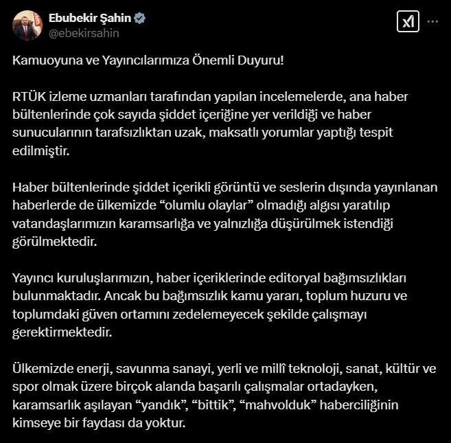 RTÜK Başkanı Ebubekir Şahin, sosyal medya hesabından yaptığı açıklamada, "RTÜK izleme uzmanları tarafından yapılan incelemelerde, ana haber bültenlerinde çok sayıda şiddet içeriğine yer verildiği ve haber sunucularının tarafsızlıktan uzak, maksatlı yorumlar yaptığı tespit edilmiştir. Haber bültenlerinde şiddet içerikli görüntü ve seslerin dışında yayınlanan haberlerde de ülkemizde olumlu olaylar olmadığı algısı yaratılıp vatandaşlarımızın karamsarlığa ve yalnızlığa düşürülmek istendiği görülmektedir. Yayıncı kuruluşlarımızın, haber içeriklerinde editoryal bağımsızlıkları bulunmaktadır. Ancak bu bağımsızlık kamu yararı, toplum huzuru ve toplumdaki güven ortamını zedelemeyecek şekilde çalışmayı gerektirmektedir. Ülkemizde enerji, savunma sanayi, yerli ve milli teknoloji, sanat, kültür ve spor olmak üzere birçok alanda başarılı çalışmalar ortadayken; karamsarlık aşılayan, 'yandık, bittik, mahvolduk' haberciliğinin kimseye bir faydası da yoktur" dedi.'HER YAYINCI KURALLARA UYMAKLA MÜKELLEFTİR'Ana haber sunucularının, olaylar karşısında kendi siyasal görüşlerini de içeren maksatlı yorum ve analizlerde bulunmalarının önemli bir husus olduğunu aktaran Şahin, "Tarafsızlıktan uzak, bir siyasi partinin temsilcisi gibi yapılan yorumlar ve analizler, gazetecilik etik ilkeleriyle bağdaşmamakta, gazetecilik mesleğine de büyük zarar vermektedir. 6112 sayılı Kanun'umuz çok açıktır ve her yayıncı kuruluş, bu kanunda belirtilen kurallara uymakla mükelleftir. Genel izleyici saatinde gençlerimizin, çocuklarımızın fiziksel ve ruhsal gelişimini olumsuz etkileyen, şiddeti yaygınlaştıran, özendiren, kanıksatan, suç ve suçluyu öven, tarafsızlık ilkesini hiçe sayan yayıncı kuruluşlarımıza kanunun bize verdiği yetki doğrultusunda gerekli yaptırımlar en üst sınırdan uygulanacaktır" açıklamasında bulundu.