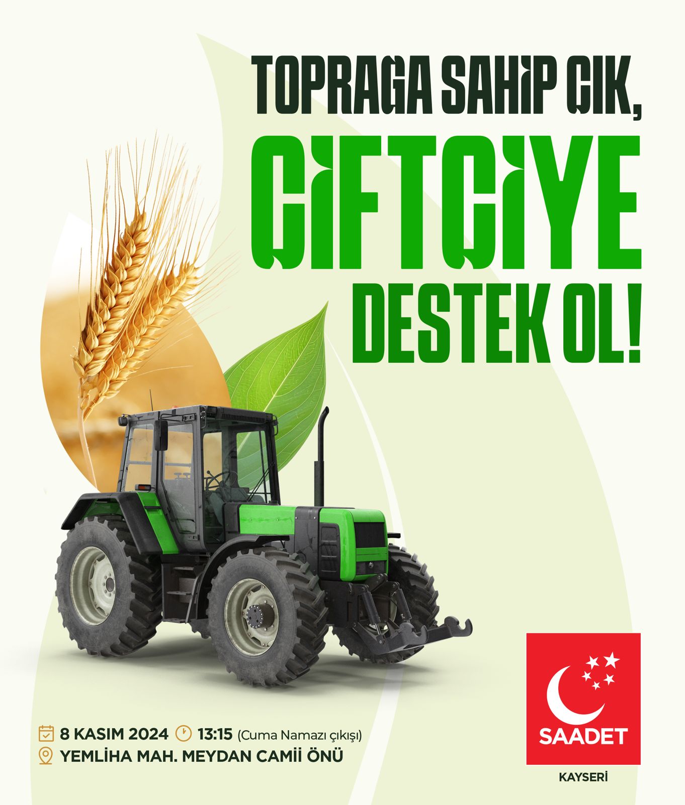 Kayseri'nin tarımda önemli bir yere sahip Yemliha Mahallesi'nde, "Toprağa Sahip Çık, Çiftçiye Destek Ol" başlıklı Saadet Partisi basın açıklaması düzenleneceğini duyurdu. 8 Kasım 2024 Cuma günü saat 13:15'te Yemliha Meydan Camii önünde gerçekleşecek etkinlikte, çiftçilerin karşılaştığı zorluklar ele alınacak ve bu sorunlara yönelik çözüm önerileri sunulacagını bildirdiler. Organizasyon, tarımın geleceği için duyarlılığın artırılmasına yönelik önemli bir adım olarak görülüyor.Toprağın geleceğinin insanlığın geleceğiyle doğrudan bağlantılı olduğunu vurgulayan etkinlik, çiftçilerin sesi olmayı ve tarımın sürdürülebilirliği konusunda farkındalık yaratmayı hedefliyor.