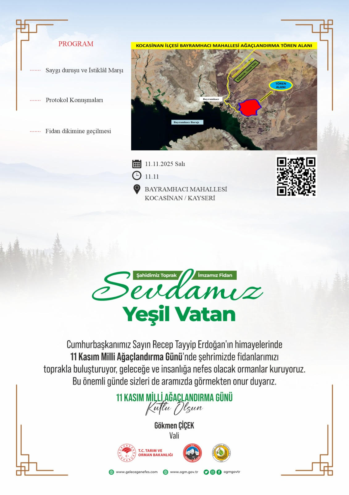 Kayseri, 11 Kasım Millî Ağaçlandırma Günü’nde yeşile olan sevgisini bir kez daha gösterecek. Cumhurbaşkanımız Sayın Recep Tayyip Erdoğan’ın himayelerinde gerçekleştirilecek olan “Sevdamız Yeşil Vatan” fidan dikim programı, Bayramhacı Mahallesi – Kocasinan bölgesinde saat 11.11’de başlayacak.