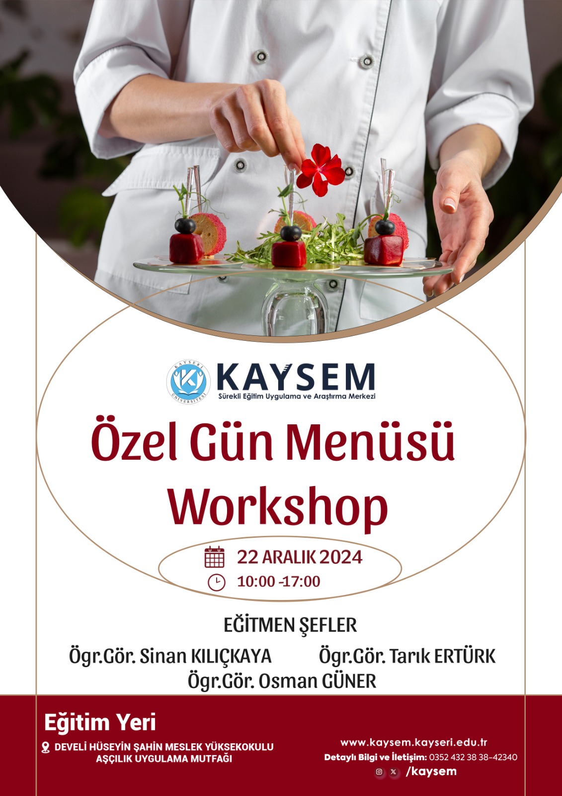 Kayseri Üniversitesi Seyrani Kampüsü Aşçılık Programı, Develi’ye lezzet dolu bir etkinlik kazandırıyor. Develi Hüseyin Şahin Meslek Yüksekokulu Aşçılık Mutfağı’nda düzenlenecek “Özel Gün Menüsü Hazırlama Eğitimi”, 22 Aralık 2024 Pazar günü saat 10.00 ile 17.00 arasında gerçekleşecek.Eğitim, Kayseri Sürekli Eğitim Uygulama ve Araştırma Merkezi (KAYSEM) organizasyonuyla planlandı. Katılımcılar, özel günlere uygun başlangıçlardan ana yemeklere, tatlılardan şık sunum tekniklerine kadar kapsamlı bir içerikle buluşacak. Ayrıca pratik hazırlık önerileri ve katılımcılara özel tariflerle profesyonel mutfak sırları paylaşılacak.Eğitime katılmak isteyenler, 20 Aralık 2024 Cuma günü saat 17.00’ye kadar 2 bin TL eğitim ücretini yatırarak kayıt yaptırabilirler. Detaylı bilgi ve kayıt için kaysem.kayseri.edu.tr adresi ziyaret edilebilir veya 0352 432 38 38-42340 numaralı telefon aranabilir.Haber : Nezir ÖTEGEN - Develi