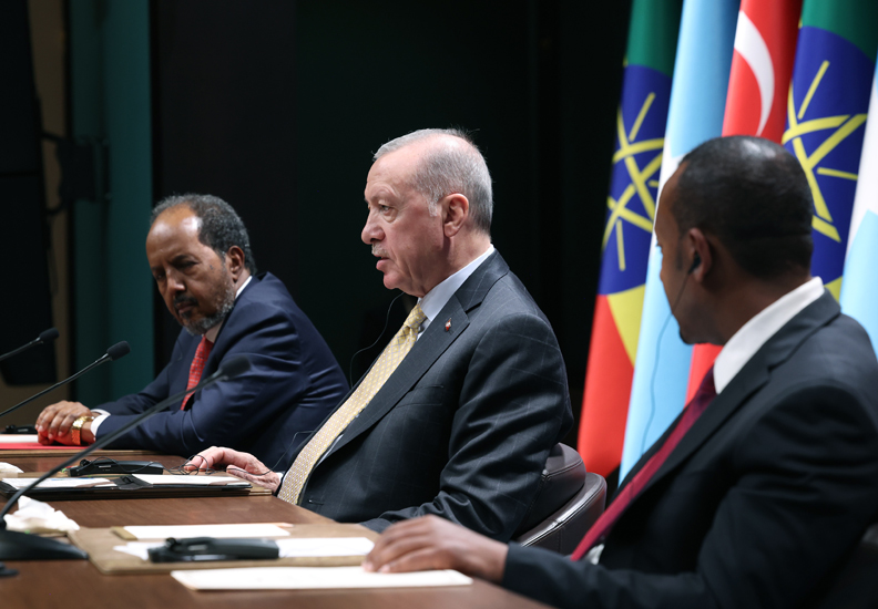 Cumhurbaşkanı Recep Tayyip Erdoğan, Somali Cumhurbaşkanı Hasan Şeyh Mahmud ve Etiyopya Başbakanı Abiy Ahmed Ali ile görüşmesinin ardından, konuk liderlerle birlikte ortak basın toplantısı düzenleyerek, basın mensuplarına açıklamalarda bulundu.