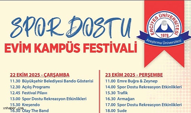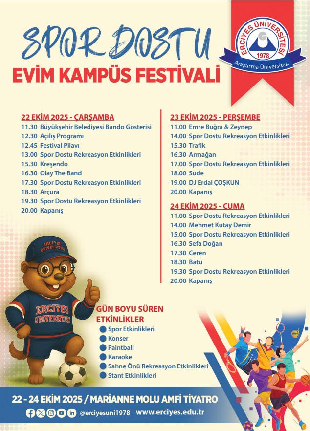 Spor Dostu Evim Kampüs Festivali 2025 Erciyes Üniversitesi’nde 22-24 Ekim tarihleri arasında gerçekleşiyor. Üç gün boyunca sürecek festivalde, öğrenciler ve katılımcılar müzik, spor ve eğlence dolu aktivitelerle dolu bir programla buluşacak.