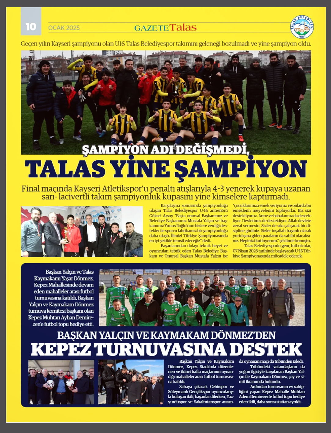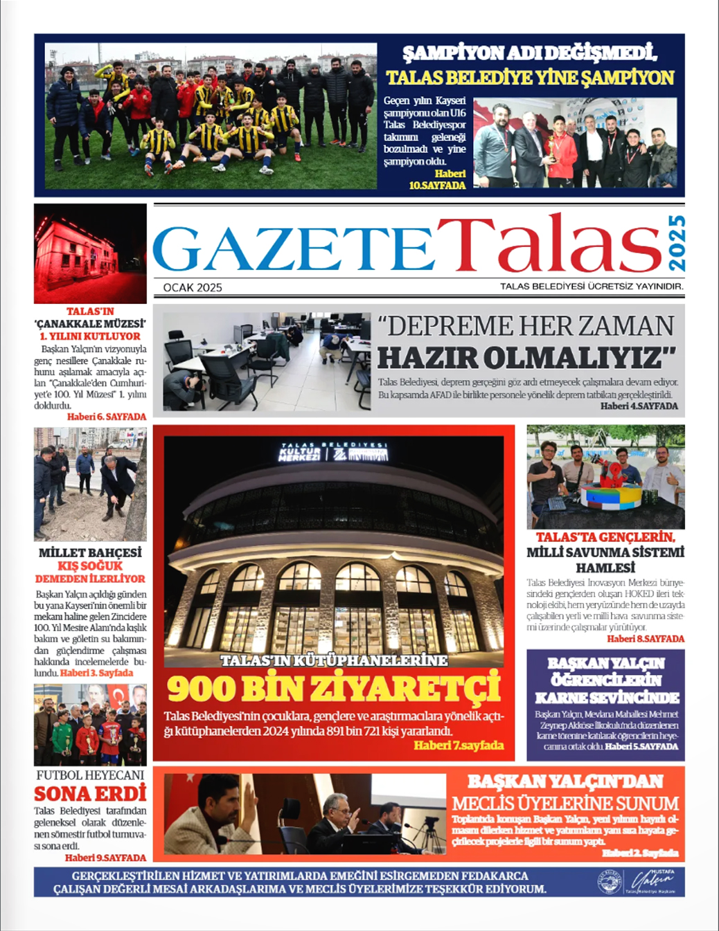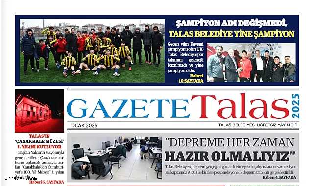 Ayrıca, Talas Belediye Başkanı Mustafa Yalçın’ın “Depreme her zaman hazır olmalıyız” başlığıyla önemli bir mesaj verdiği gazetenin sürmanşetinde, Talasgücü Belediyespor’un kazandığı şampiyonluk da öne çıktı. “Şampiyonun adı değişmedi, Talas Belediye yine şampiyon” başlığıyla duyurulan bu başarı, şehirde büyük bir sevinçle karşılandı.