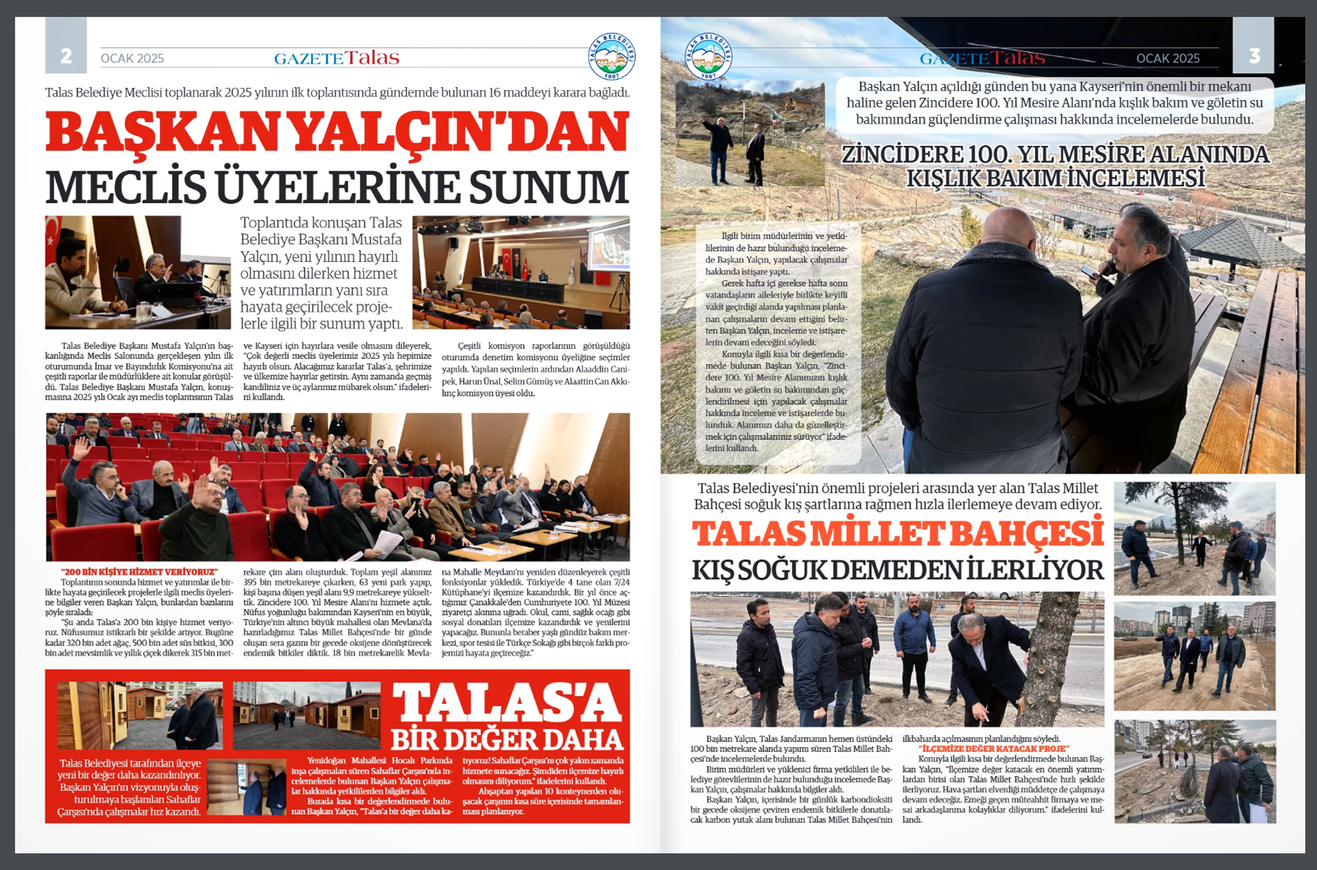 Gazetede ayrıca, Başkan Yalçın’ın yeni projeleri ve Talas’a yönelik yatırımlarına da geniş bir yer verildi. Gazete, dijital ortamda https://www.talas.bel.tr/gazete/2025-ocak adresinden temin edilebiliyor.