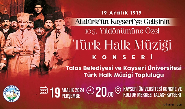 Talas Belediyesi ve Kayseri Üniversitesi (KAYÜ) Türk Halk Müziği Toplulukları, Atatürk’ün Kayseri’ye gelişinin 105. yılına özel bir konser düzenliyor. 19 Aralık Perşembe günü saat 20.00’de KAYÜ Kongre ve Kültür Merkezi’nde gerçekleşecek olan konser, Atatürk’ün sevdiği şarkıların yanı sıra Türk halk müziğinin eşsiz ezgilerini de dinleyicilere sunacak. Katılımın ücretsiz olduğu etkinlik, kültür-sanatseverlere unutulmaz bir gece vaat ediyor.
