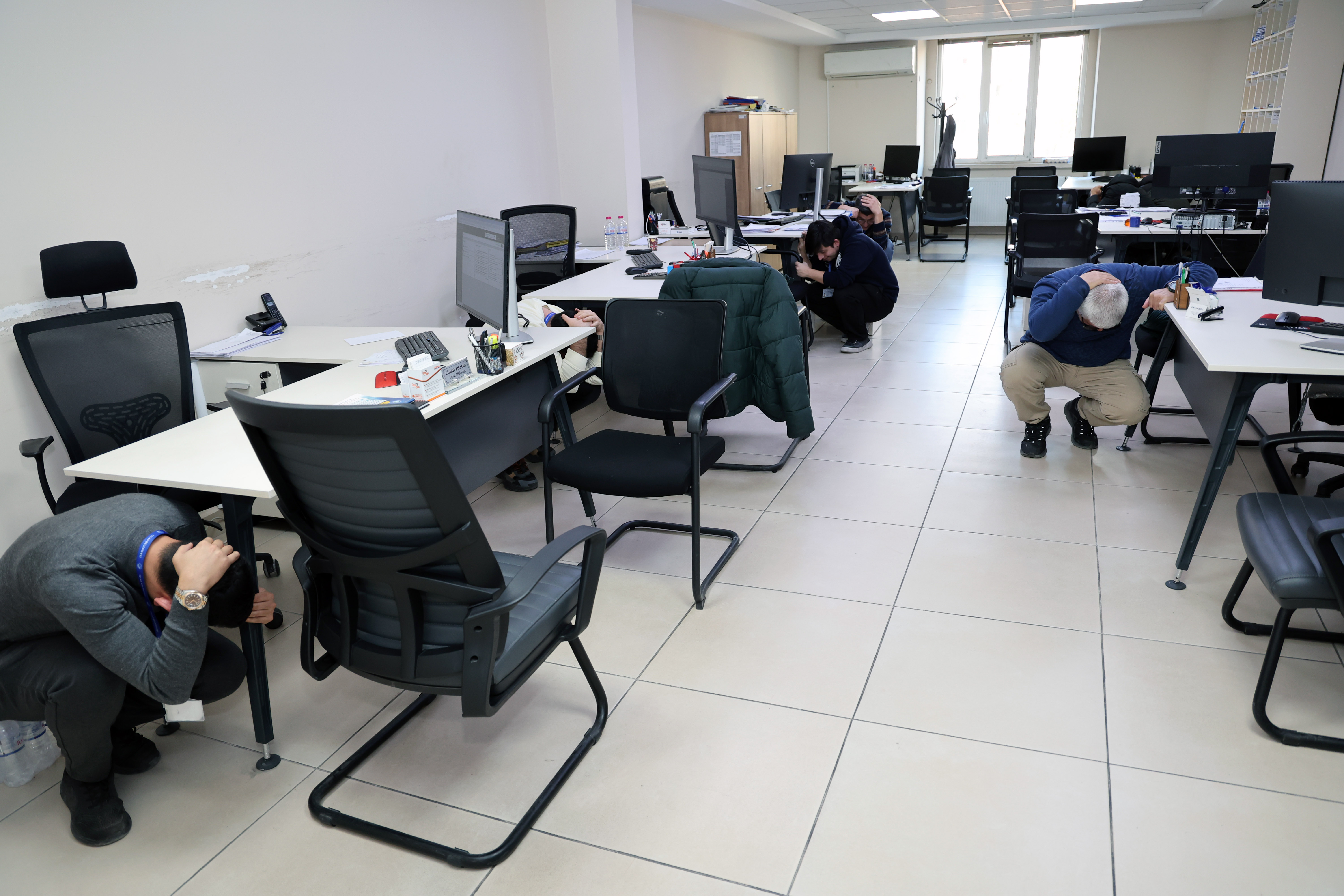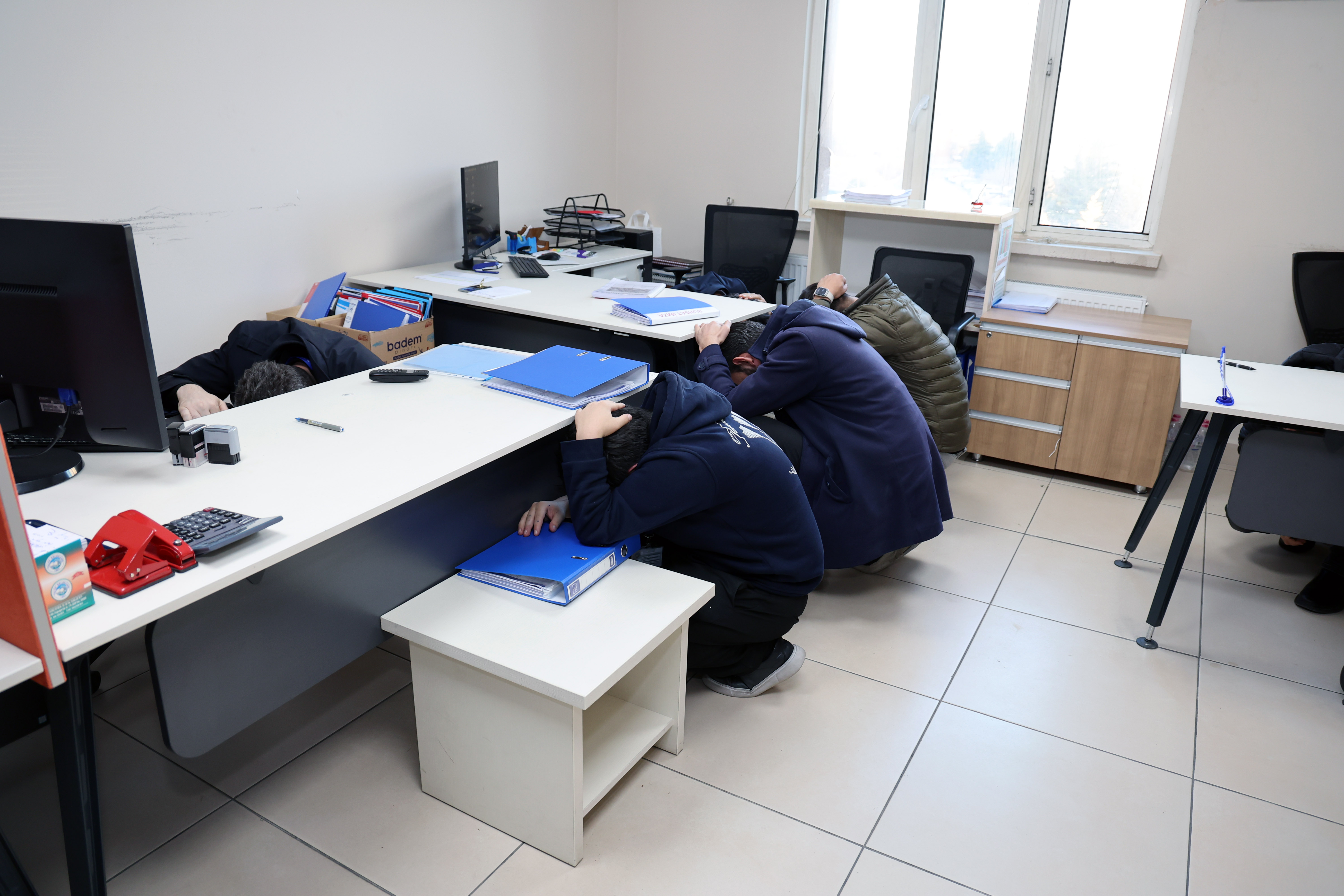 Talas Belediyesi, olası bir deprem gerçeğine karşı önlemleri artırmaya devam ediyor. Bu kapsamda, AFAD Kayseri İl Müdürlüğü ile ortaklaşa düzenlenen deprem tatbikatı, belediye hizmet binasında çalışan personele yönelik gerçekleştirildi. Tatbikat, bina içindeki sirenlerin çalmasıyla başladı. Çalan sirenler üzerine, personel hemen çök-kapan-tutun hareketiyle güvenli bir pozisyonda kalmaya çalıştı. Alarm sonrasında ise, çalışanlar kafalarını elleriyle koruyarak binadan hızla tahliye oldu ve belediye meydanındaki toplanma alanında buluştu.