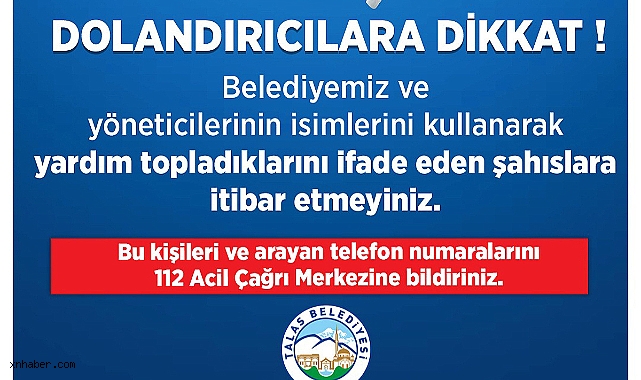 Talas Belediyesi, ayrıca bu tür dolandırıcılık faaliyetlerinin önüne geçmek için gerekli yasal işlemleri başlatacaklarını belirtti.
