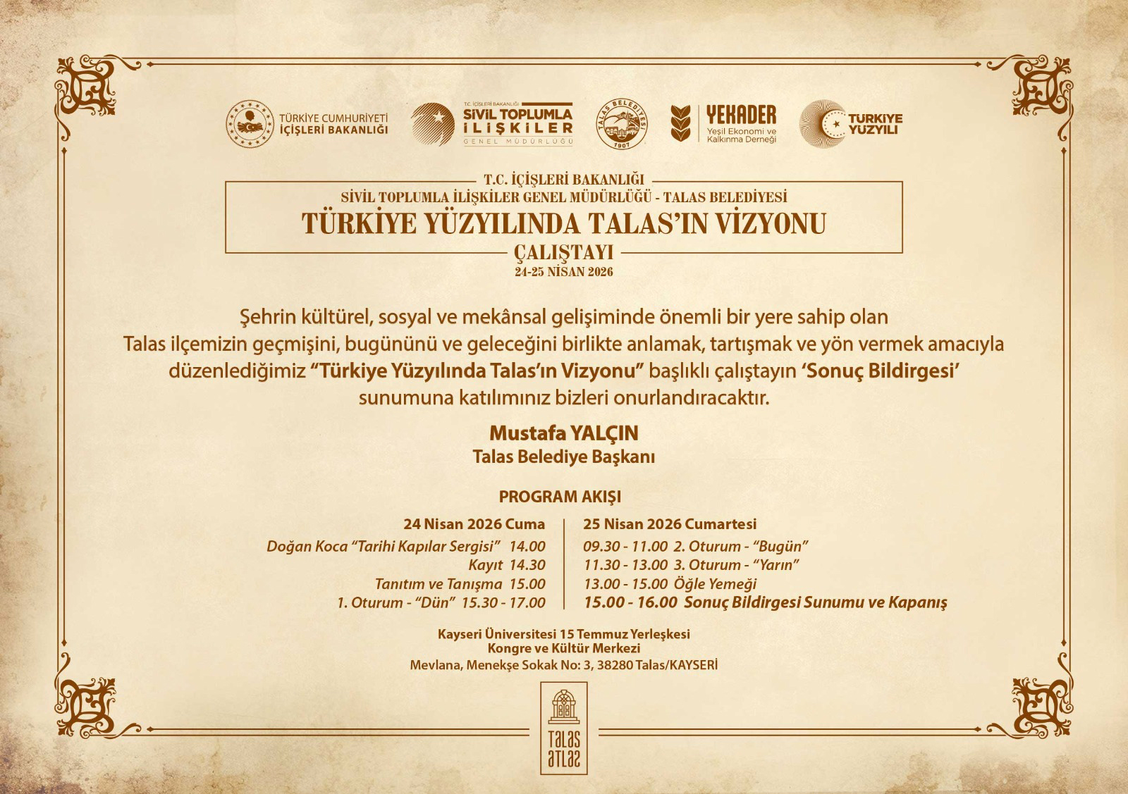 Kayseri’nin Talas ilçesinde geleceğe yön verecek önemli bir organizasyon hayata geçiriliyor. Talas Belediyesi öncülüğünde, İçişleri Bakanlığı Sivil Toplumla İlişkiler Genel Müdürlüğünün destekleriyle düzenlenen “Türkiye Yüzyılında Talas’ın Vizyonu” çalıştayı, 24-25 Nisan 2026 tarihlerinde Kayseri Üniversitesi 15 Temmuz Yerleşkesi Kongre ve Kültür Merkezi’nde yapılacak.