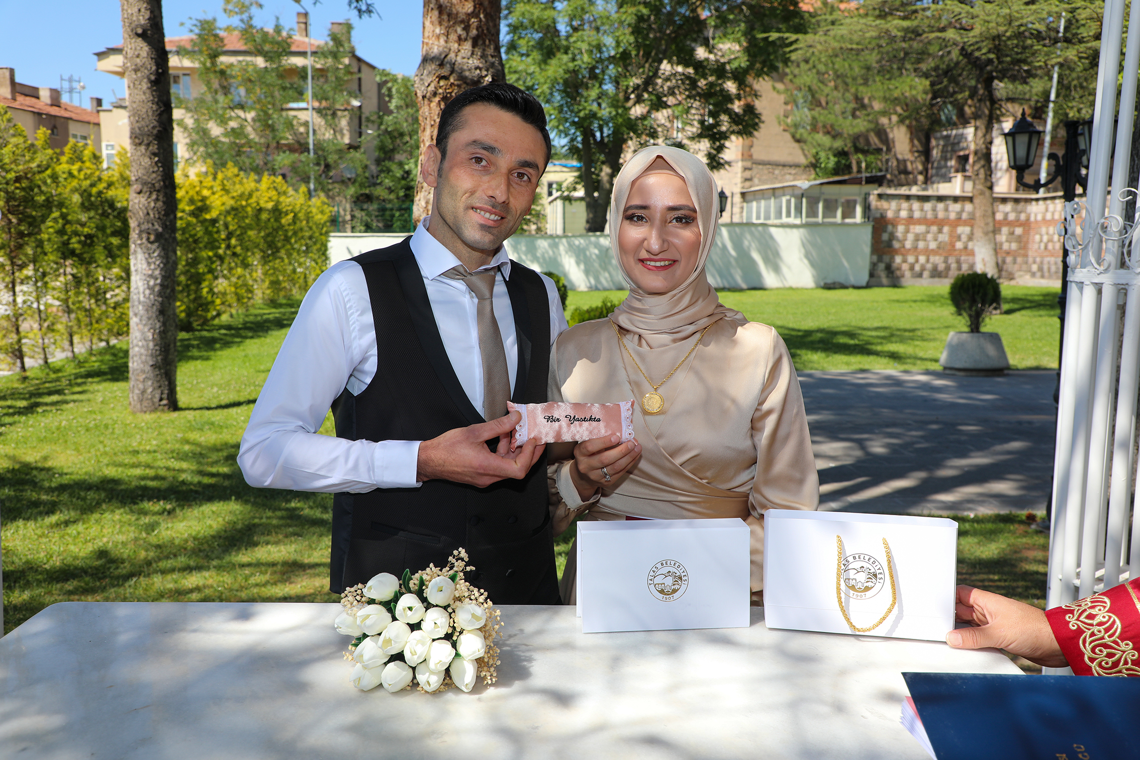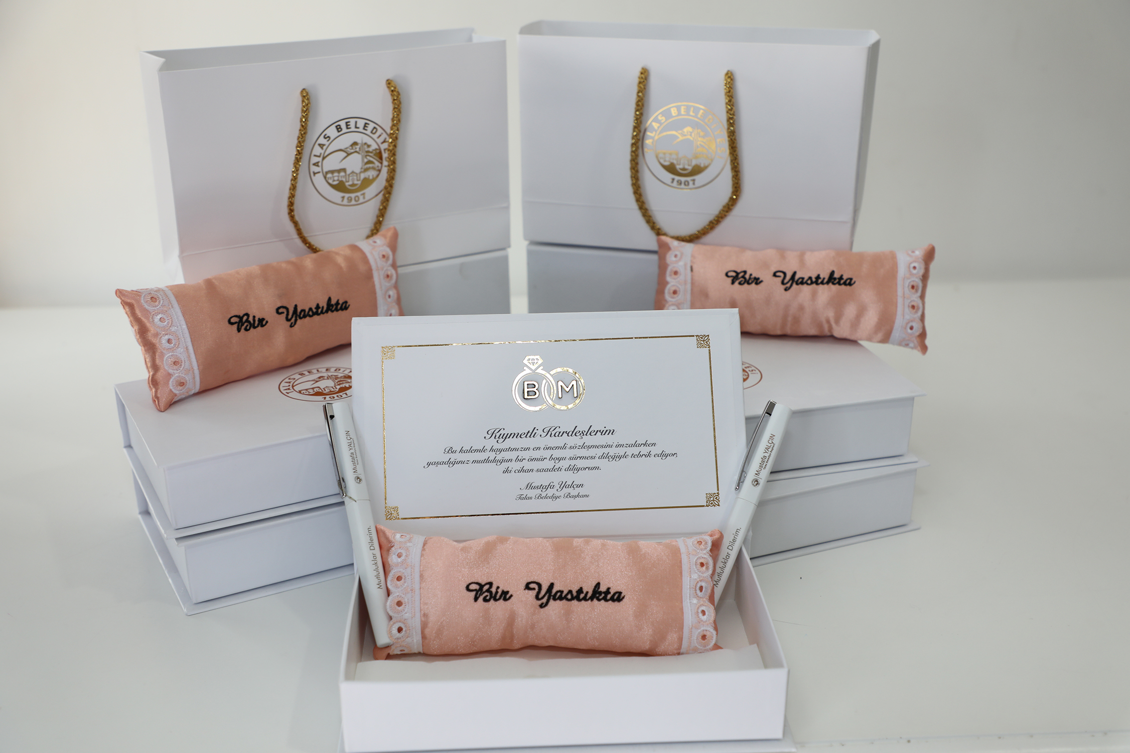 Talas Belediyesi, evliliklerini taçlandıran çiftlere özel bir jestte bulunarak, "Bir Yastıkta" temalı nikâh hediyelerini takdim ediyor. Bu hediyeler arasında çiftlerin nikâh defterini imzaladıkları kalem, 'Bir Yastıkta' yazılı mini yastık ve Başkan Mustafa Yalçın’ın tebrik mesajı yer alıyor. Yalçın, mesajında “Sevgili kardeşlerim, bu kalemle hayatınızın en önemli sözleşmesini imzalarken yaşadığınız mutluluğun bir ömür boyu sürmesi dileğiyle tebrik ediyor, iki cihan saadeti diliyorum” dedi.