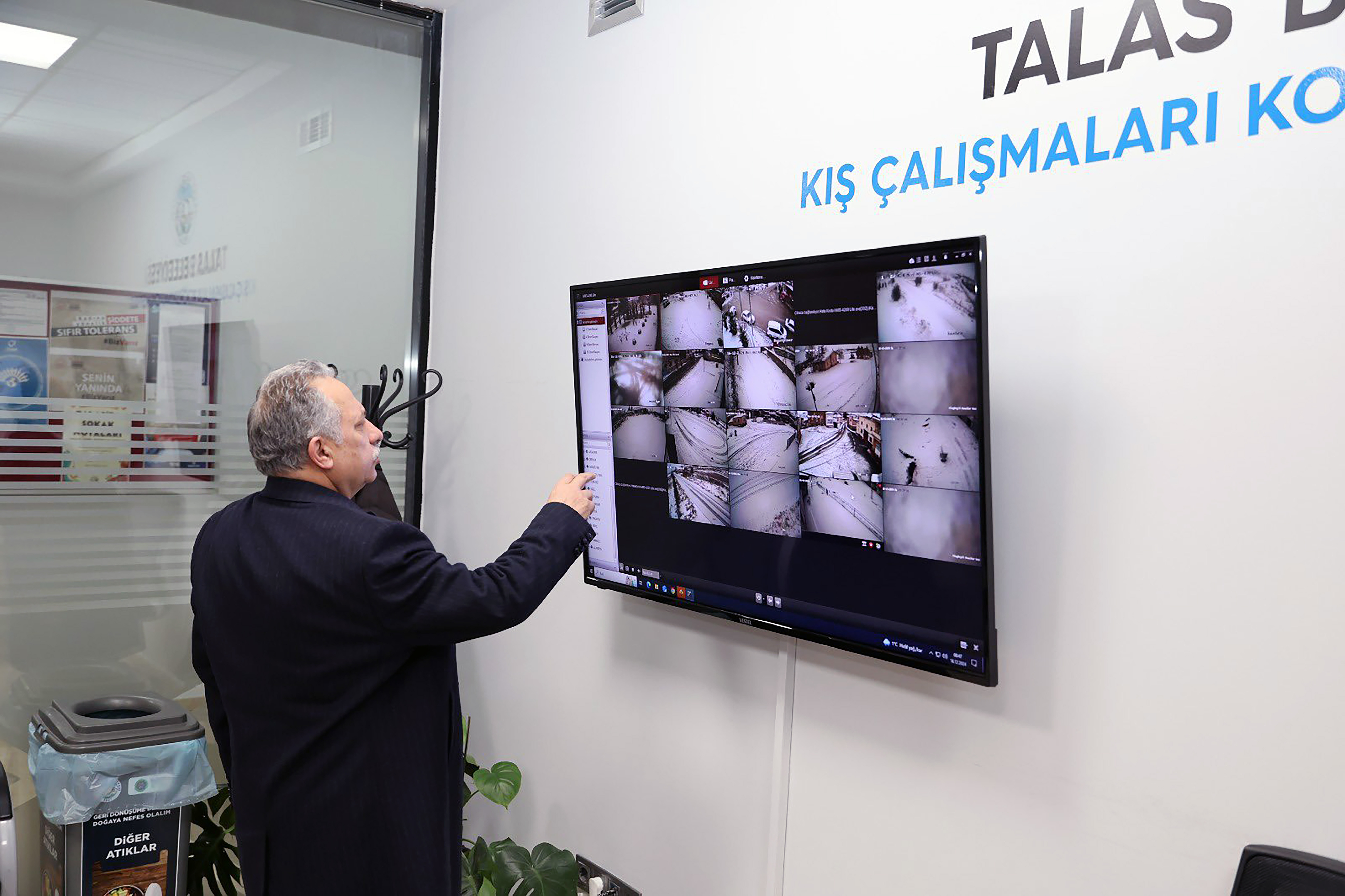 Talas Belediye Başkanı Mustafa Yalçın’ın, dört yıl önce belediye binasında özel olarak kurduğu Kış Çalışmaları Koordinasyon Merkezi, ekiplerin yağış ve hava sıcaklıklarını anbean takip etmesine olanak tanıyor. Kar yağışının yoğunlaştığı bölgelere hızlıca müdahale edebilmek için teknolojik donanım kullanılıyor. Ekipler, ilçedeki 22 kırsal mahalle ve ana arterlerdeki yolları kameralarla takip ederek, ulaşımın aksamasını engelliyor.