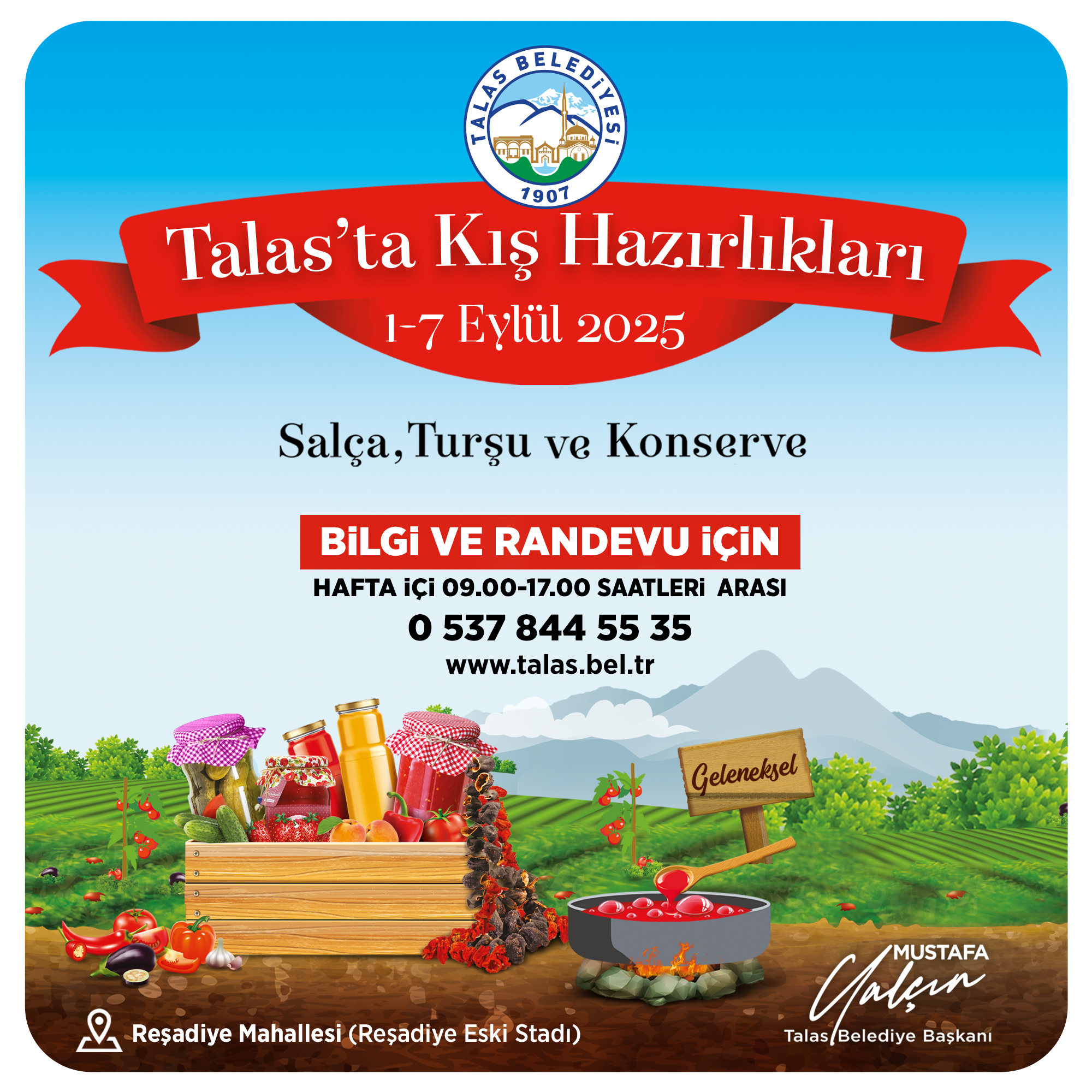 “Bizim kültürümüzde kış hazırlıkları, sadece mutfaklarımızı değil; aynı zamanda ailelerimiz arasındaki dayanışmayı da güçlendiren bir gelenek. Talas Belediyesi olarak vatandaşlarımızın bu hazırlıkları hijyenik, pratik ve ekonomik şekilde yapabilmeleri için gerekli ortamı oluşturuyoruz. Salça, turşu ve konserve hazırlıklarıyla hem geçmişten gelen kültürümüzü yaşatıyor hem de aile bütçelerine katkı sunuyoruz. Tüm hemşehrilerimizi bu güzel etkinliğe davet ediyorum.”