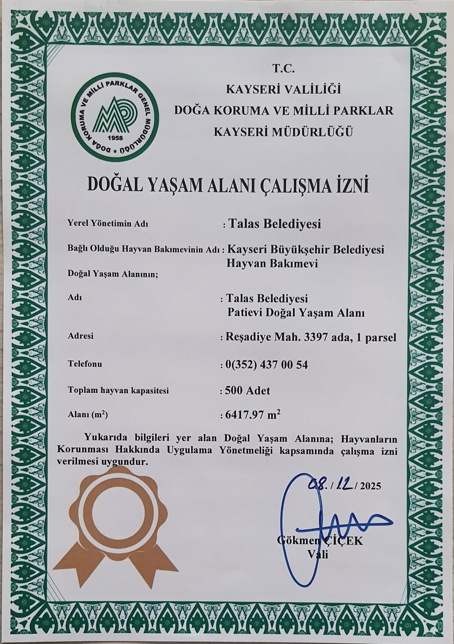 Açıldığı günden bu yana 10 binin üzerinde cana ev sahipliği yapan merkezde bugün 70’ten fazlası yavru olmak üzere 223 pati yaşamını sürdürüyor. Bugüne kadar 1.495 hayvan, hayvanseverler tarafından sahiplenilerek sıcak yuvalarına kavuştu.Haftanın 7 günü ziyarete açık olan Talas Patievi, vatandaşların can dostlarla birebir temas kurabildiği, farkındalık oluşturan bir sosyal alan olma özelliği de taşıyor.“Burası Bir Barınak Değil”Talas Belediye Başkanı Mustafa Yalçın, merkezin aldığı resmi onayın uzun yıllardır sürdürülen anlayışın sonucu olduğunu belirterek şu ifadeleri kullandı:“Burası klasik bir barınak değil, gerçek anlamda bir doğal yaşam alanı. 500 cana yuva olabilecek kapasiteye ulaşan patievimiz, Talas’ta merhametin ve sorumluluğun kurumsallaşmış halidir.”Yasal zorunluluklar yürürlüğe girmeden önce hayata geçirilen Talas Patievi Doğal Yaşam Alanı, aldığı bu onayla birlikte hem Kayseri’de hem de Türkiye genelinde örnek proje olma misyonunu güçlendirerek yoluna devam ediyor.