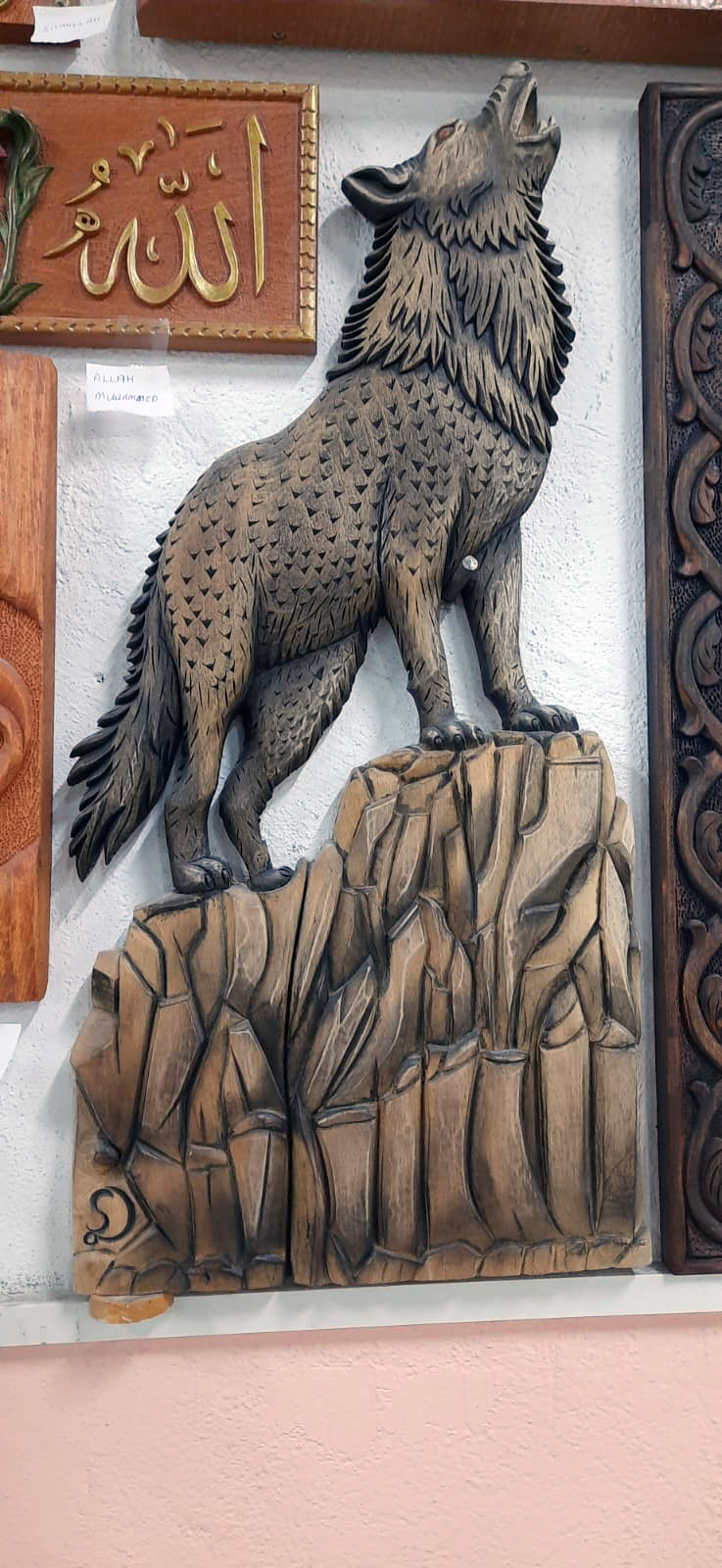 Taş üzerine işlenen Osmanlı Devlet Arması rölyefi, detaylardaki incelik ve derinlik duygusuyla klasik bezeme sanatının güçlü bir yansıması olarak öne çıkıyor. Ahşap oyma atölyesinde hazırlanan bozkurt figürü ise hareketli formu, tüy detayları ve doğal ahşap dokusunun korunmasıyla profesyonel ustalık seviyesinde bir çalışma olarak dikkat çekiyor.