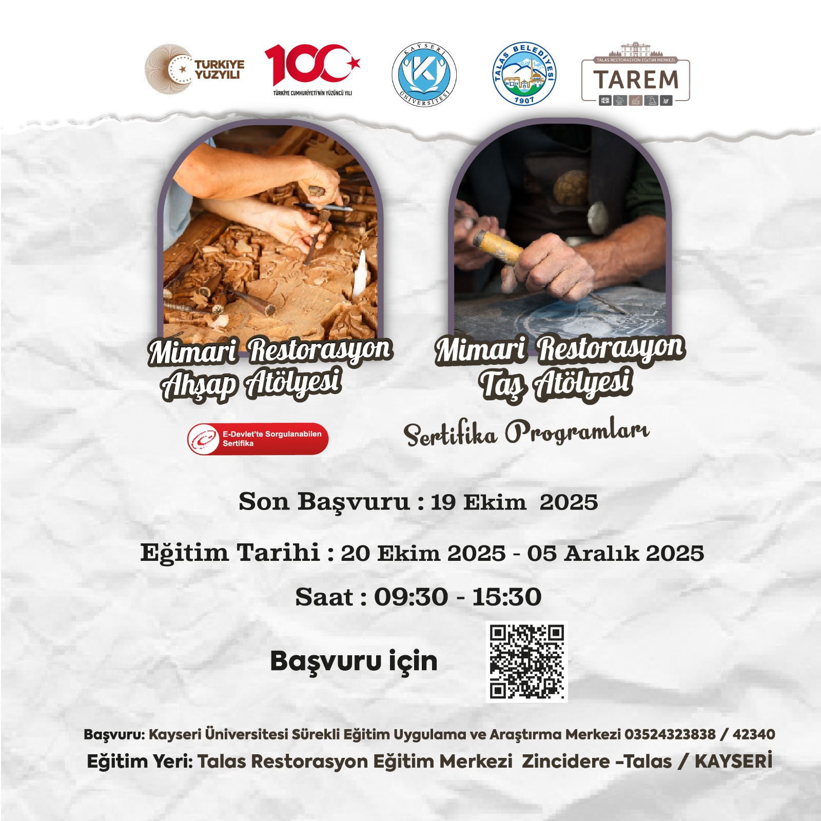 Merkezde, mimari restorasyon ahşap ve mimari restorasyon taş atölyelerinde her yaştan katılımcıya teorik ve uygulamalı eğitimler veriliyor. Katılımcılar, Talas’ın Zincidere Mahallesi’ndeki tarihi Kız Yetimhanesi müştemilatında düzenlenen kurslara, herhangi bir ön sınava girmeden kayıt yaptırabiliyor.
