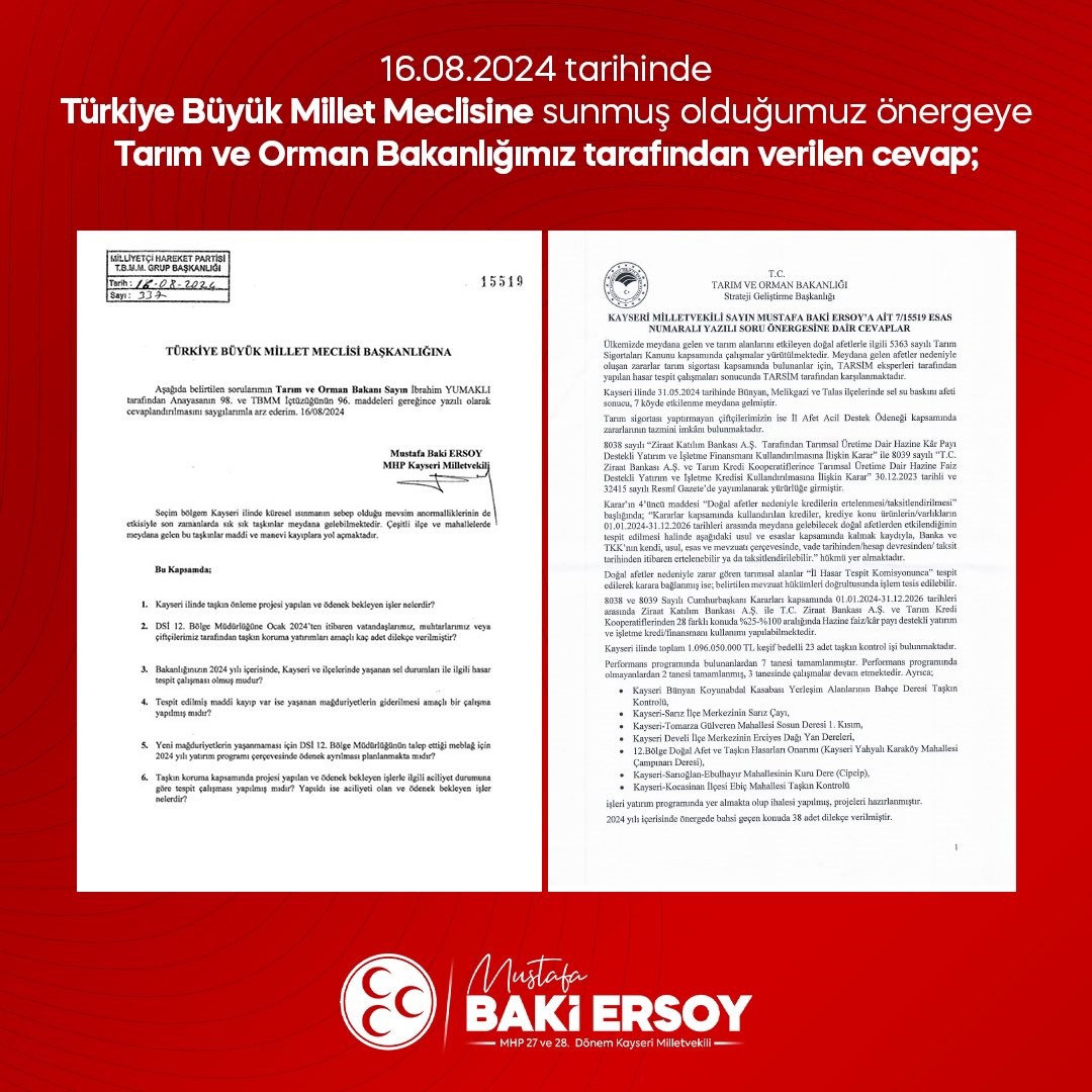 Tarım ve Orman Bakanlığı tarafından önergeye verilen cevapta şu ifadelere yer verildi:“Kayseri İlinde toplam 1 milyar 096 milyon 50 bin TL keşif bedelli 23 adet taşkın kontrol işi bulunmaktadır. Performans programında bulunanlardan 7 tanesi tamamlanmıştır. Performans programında olmayanlardan 2 tanesi tamamlanmış, 3 tanesinde çalışmalar devam etmektedir. Ayrıca, Kayseri Bünyan Koyunabdal Kasabası Yerleşim Alanlarının Bahçe Deresi Taşkın Kontrolü, Kayseri-Sarız İlçe merkezinin Sarız Çayı, Kayseri-Tomarza Gülveren Mahallesi Sosun Deresi 1. Kısım Kayseri Develi İlçe Merkezinin Erciyes Dağı Yan Dereleri, 12. Bölge Doğal Afet ve Taşkın hasarları onarımı (Kayseri Yahyalı Karaköy Mahallesi Çampınarı Deresi), Kayseri-Sarıoğlan- Ebulhayır Mahallesi Kuru Dere (Cipcip), Kayseri- Kocasinan İlçesi Ebiç Mahallesi Taşkın Kontrolü İşleri yatırım programında olup ihalesi yapılmış ve projeleri hazırlanmıştır. 2024 yılı içerisinde önergede bahsi geçen konuda 38 adet