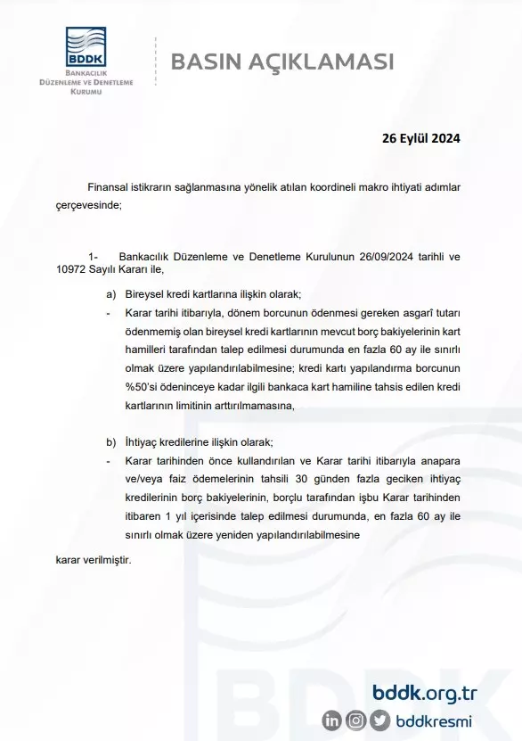 Türkiye Cumhuriyet Merkez Bankası (TCMB) ile Bankacılık Düzenleme ve Denetleme Kurumu (BDDK), bireysel kredi kartlarına yönelik düzenlemelerde eş güdümlü adımlar atarak vatandaşların kredi borçlarını yönetmelerine yardımcı olacak bir dizi karar açıkladı. TCMB'nin "Kredi Kartı İşlemlerinde Uygulanacak Azami Faiz Oranları Hakkında Tebliğ’de Değişiklik Yapılmasına Dair Tebliği" Resmi Gazete'de yayımlanırken, BDDK'nin ilgili Kurul kararı da internet sitesinde duyuruldu.BDDK'nın aldığı kararlar doğrultusunda, bireysel kredi kartı ve ihtiyaç kredisi borçlarını ödeyemeyenlere 60 aya kadar yapılandırma imkanı sağlandı. Bu düzenlemeyle, kredi kartı dönem borcunun asgari tutarını ödeyemeyen vatandaşlar, mevcut kredi kartı borç bakiyelerini 60 aya kadar yapılandırabilecekler. Bu süreçte, her aya düşen taksit tutarı ilgili ayın asgari ödeme tutarına eklenerek hesaplanacak. Ayrıca, yapılandırılmış kredi kartı borcunun en az yarısı ödeninceye kadar, borçlunun ilgili bankadaki kredi kartı limiti artırılamayacak.TCMB de bu düzenlemeyle uyumlu olarak bireysel kredi kartlarında yapılandırma esnasında uygulanacak azami faiz oranını referans faiz oranı olan %3,11 ile sınırlandırdı. Buna göre, yapılandırmaya gidilen kredi kartı borçlarına uygulanacak faiz oranı belirli sınırlar içinde tutulacak.İhtiyaç kredileri tarafında da önemli bir düzenleme getirildi. Anapara ve faiz ödemelerinde 30 günden fazla gecikme yaşanması durumunda, herhangi bir ilave kredi almadan borçlar 60 aya kadar yapılandırılabilecek. Bu imkandan yararlanmak isteyen borçluların, yapılandırma için bir yıl içinde başvuruda bulunması gerekiyor.