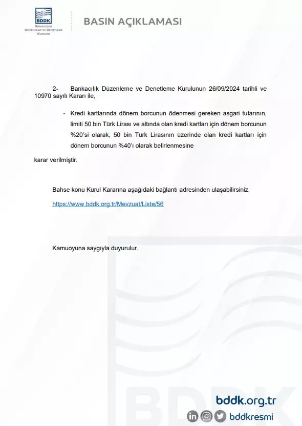 BDDK, bireysel kredi kartlarının asgari ödeme oranlarında da düzenlemeye gitti. Dönem borcunun %20’si olan asgari ödeme oranı sınır tutarı, 25 bin TL'den 50 bin TL'ye yükseltildi. Buna göre, 50 bin TL ve altında borcu olan kredi kartları için asgari ödeme oranı dönem borcunun %20'si olarak uygulanacak. Ancak 50 bin TL'nin üzerinde borcu olanlar için bu oran %40 olacak.Bu düzenlemelerle uyumlu olarak TCMB, bireysel kredi kartlarına uygulanan azami akdi faiz oranlarını da kredi kartı dönem borçlarına göre referans faiz oranına bağlı olarak farklılaştırdı. Bu kapsamda belirlenen yeni oranlar 24 Ekim'de açıklanacak ve 1 Kasım'da yürürlüğe girecek.Referans faiz oranının sabit kalması halinde, azami akdi faiz oranları şu şekilde uygulanacak:- Dönem borcu 25 bin TL'nin altında olan kredi kartları için %3,50