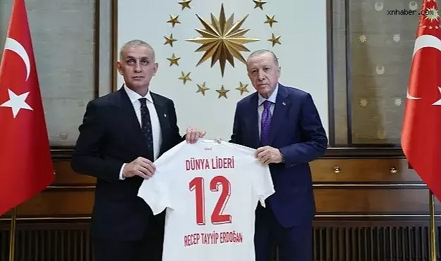 Cumhurbaşkanı Recep Tayyip Erdoğan, Türkiye Futbol Federasyonu (TFF) Başkanı İbrahim Hacıosmanoğlu ve beraberindekileri Cumhurbaşkanlığı Külliyesi’nde kabul etti. Görüşme sırasında Hacıosmanoğlu, Cumhurbaşkanı Erdoğan’a A Milli Takım futbolcularının imzalarının bulunduğu bir forma takdim etti. Formanın arkasında "Dünya Lideri" ifadesi yer aldı. Ziyaret, TFF ile devletin ilişkilerinin kuvvetlenmesi adına önemli bir buluşma olarak değerlendirildi.