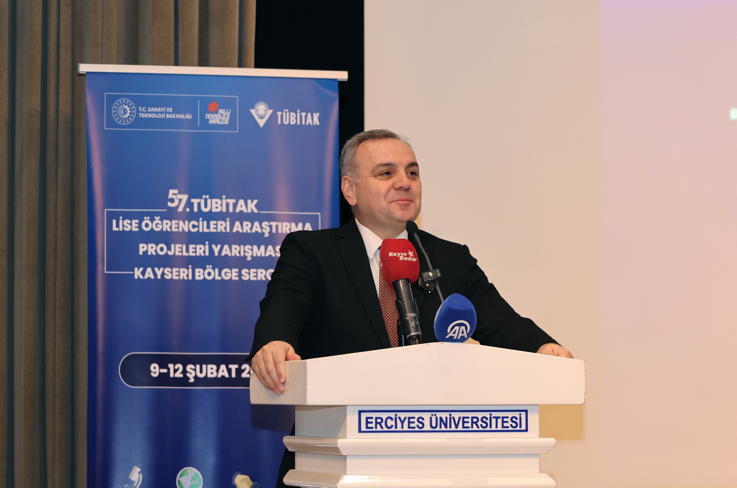 TÜBİTAK 57. Lise Öğrencileri Araştırma Projeleri Yarışması Kayseri Bölge Sergisi’nin ödül töreni, Erciyes Üniversitesi (ERÜ) ev sahipliğinde Sabancı Kültür Sitesi’nde düzenlendi. Törene; ERÜ Rektörü Prof. Dr. Fatih Altun, Kayseri Vali Yardımcısı Mehmet Türköz, il milli eğitim müdürleri, belediye yetkilileri, TÜBİTAK temsilcileri, akademisyenler, öğretmenler ve öğrenciler katıldı.