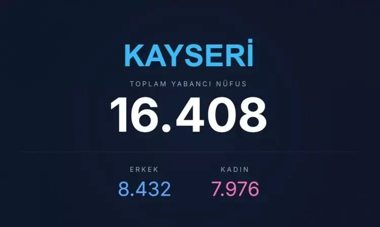 Açıklanan verilere göre Kayseri’de toplam 16 bin 408 yabancı uyruklu kişi bulunuyor. Bu kişilerin 8 bin 432’sini erkekler, 7 bin 976’sını ise kadınlar oluşturuyor.
